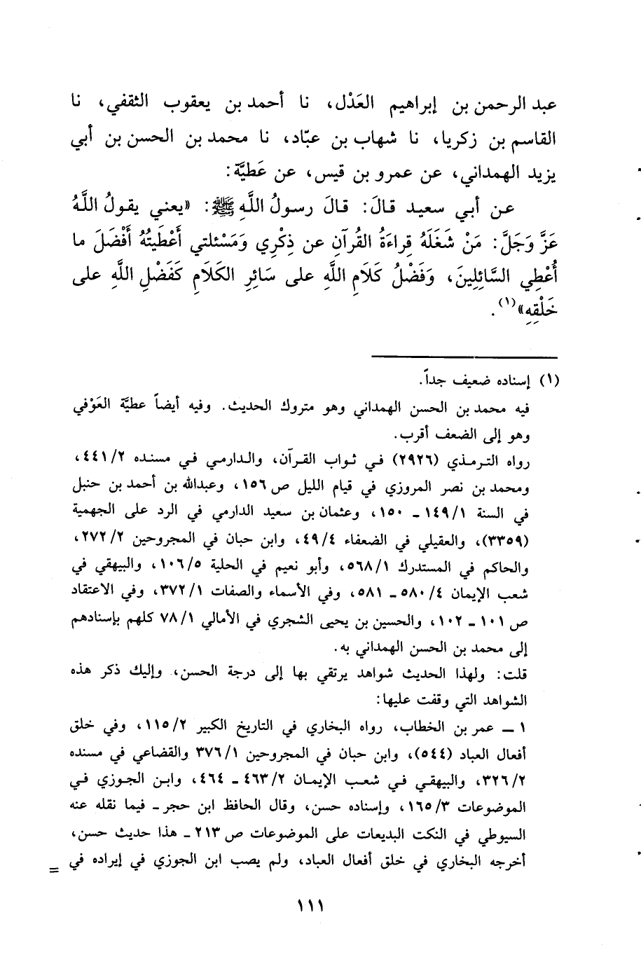 عَبْدُ الرَّحْمَنِ بْنُ إِبْرَاهِيمَ الْعَدْلُ، نا أَحْمَدُ بْنُ يَعْقُوبَ الثَّقَفِيُّ، نا الْقَاسِمُ بْنُ زَكَرِيَّا، نا شِهَابُ بْنُ عَبَّادٍ، نا مُحَمَّدُ بْنُ الْحَسَنِ بْنِ أَبِي يَزِيدَ الْهَمْدَانِيُّ، عَنْ عَمْرِو بْنِ قَيْسٍ، عَنْ عَطِيَّةَ، عَنْ أَبِي سَعِيدٍ، قَالَ: قَالَ رَسُولُ اللَّهِ صَلَّى اللَّهُ عَلَيْهِ وَسَلَّمَ: " يَعْنِي يَقُولُ اللَّهُ عَزَّ وَجَلَّ: §مَنْ شَغَلَهُ قِرَاءَةُ الْقُرْآنِ عَنْ ذِكْرِي وَمَسْأَلَتِي، أَعْطَيْتُهُ أَفْضَلَ مَا أُعْطِي السَّائِلِينَ، وَفَضْلُ كَلامِ اللَّهِ عَلَى سَائِرِ الْكَلامِ، كَفَضْلِ اللَّهِ عَلَى خَلْقِهِ "