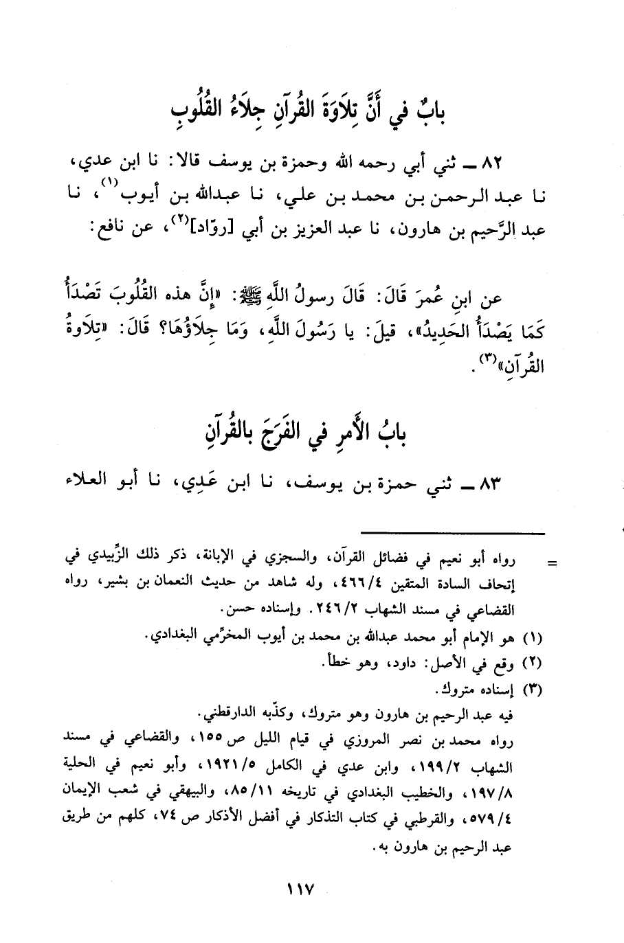 82 - ثني أَبِي رَحِمَهُ اللَّهُ، وَحَمْزَةُ بْنُ يُوسُفَ، قَالا: نا ابْنُ عَدِيٍّ، نا عَبْدُ الرَّحْمَنِ بْنُ مُحَمَّدِ بْنِ عَلِيٍّ، نا عَبْدُ اللَّهِ بْنُ أَيُّوبَ، نا عَبْدُ الرَّحِيمِ بْنُ هَارُونَ، نا عَبْدُ الْعَزِيزِ بْنُ أَبِي رَوَّادٍ، عَنْ نَافِعٍ، عَنِ ابْنِ عُمَرَ، قَالَ: قَالَ رَسُولُ اللَّهِ صَلَّى اللَّهُ عَلَيْهِ وَسَلَّمَ: «إِنَّ §هَذِهِ الْقُلُوبَ تَصْدَأُ كَمَا يَصْدَأُ الْحَدِيدُ»، قِيلَ: يَا رَسُولَ اللَّهِ، وَمَا جَلاؤُهَا؟، قَالَ: «تِلاوَةُ الْقُرْآنِ»