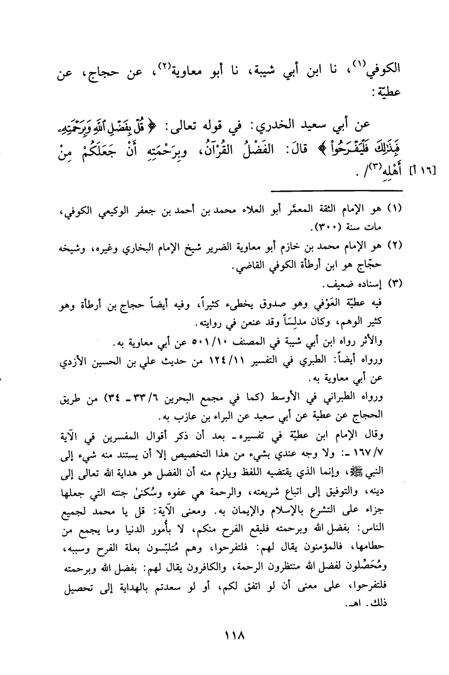 الْكُوفِيُّ، نا ابْنُ أَبِي شَيْبَةَ، نا أَبُو مُعَاوِيَةَ، عَنْ حَجَّاجٍ، عَنْ عَطِيَّةَ، عَنْ أَبِي سَعِيدٍ الْخُدْرِيِّ، فِي قَوْلِهِ تَعَالَى " § {قُلْ بِفَضْلِ اللَّهِ وَبِرَحْمَتِهِ فَبِذَلِكَ فَلْيَفْرَحُوا} [يونس: 58]، قَالَ: الْفَضْلُ الْقُرْآنُ، وَبِرَحْمَتِهِ أَنْ جَعَلَكُمْ مِنْ أَهْلِهِ "