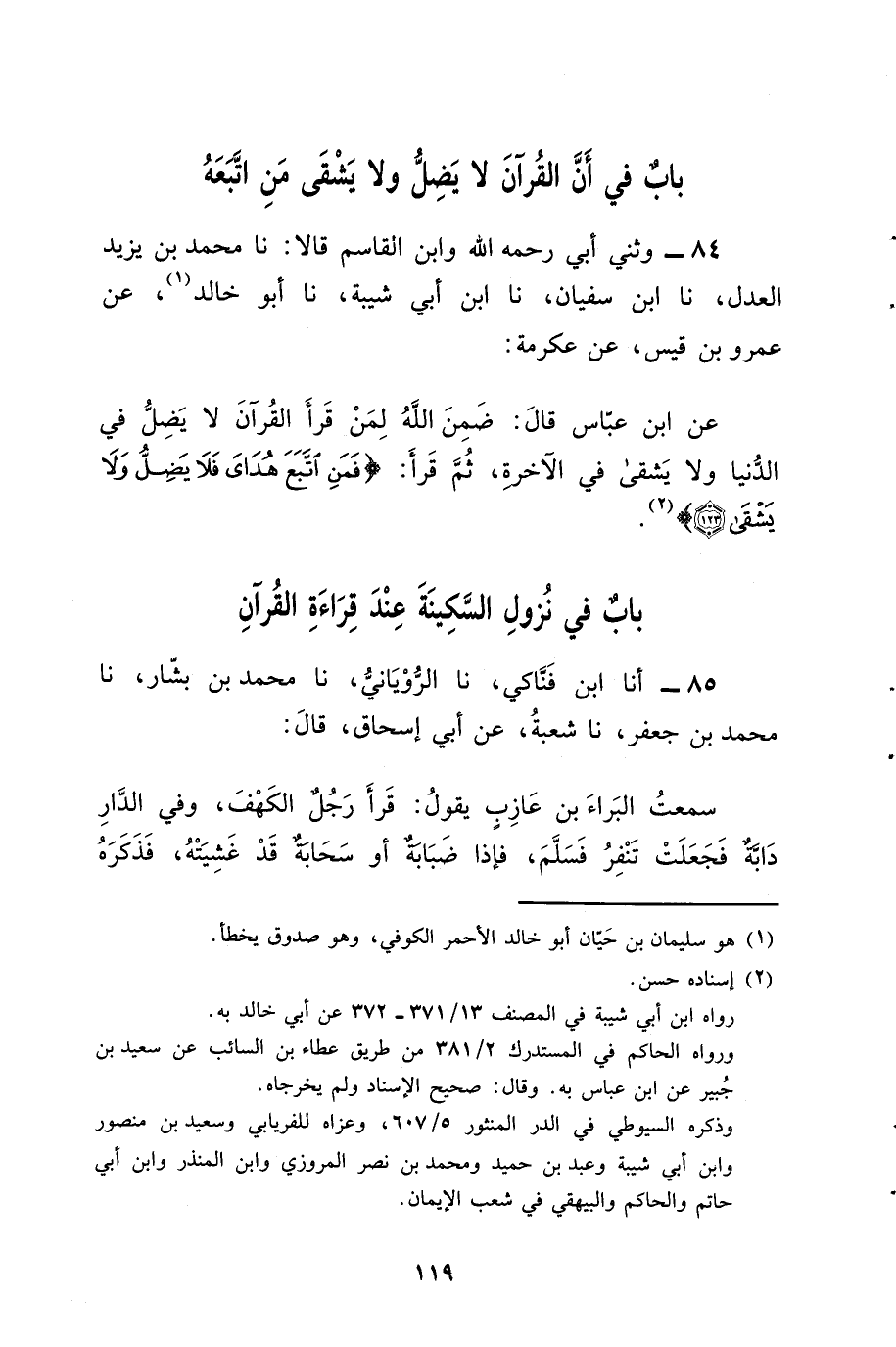 84 - وثنى أَبِي رَحِمَهُ اللَّهُ، وَابْنُ الْقَاسِمِ، قَالا: نا مُحَمَّدُ بْنُ يَزِيدَ الْعَدْلُ، نا ابْنُ سُفْيَانَ، نا ابْنُ أَبِي شَيْبَةَ، نا أَبُو خَالِدٍ، عَنْ عَمْرِو بْنِ قَيْسٍ، عَنْ عِكْرِمَةَ، عَنِ ابْنِ عَبَّاسٍ، قَالَ: " §ضَمِنَ اللَّهُ لِمَنْ قَرَأَ الْقُرْآنَ لا يَضِلُّ فِي الدُّنْيَا , وَلا يَشْقَى فِي الآخِرَةِ، ثُمَّ قَرَأَ: {فَمَنِ اتَّبَعَ هُدَايَ فَلا يَضِلُّ وَلا يَشْقَى} [طه: 123] "
