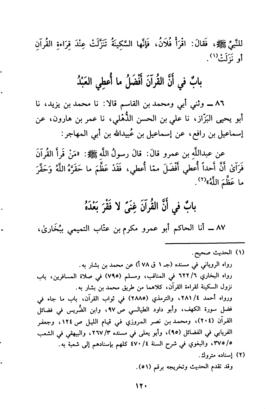 86 - وثني أَبِي، وَمُحَمَّدُ بْنُ الْقَاسِمِ، قَالا: نا مُحَمَّدُ بْنُ يَزِيدَ، نا أَبُو يَحْيَى الْبَزَّازُ، نا عَلِيُّ بْنُ الْحَسَنِ الذُّهْلِيُّ، نا عُمَرُ بْنُ هَارُونَ، عَنْ إِسْمَاعِيلَ بْنَ رَافِعٍ، عَنْ إِسْمَاعِيلَ بْنِ عُبَيْدِ اللَّهِ بْنِ أَبِي الْمُهَاجِرِ، عَنْ عَبْدِ اللَّهِ بْنِ عَمْرٍو، قَالَ: قَالَ رَسُولُ اللَّهِ صَلَّى اللَّهُ عَلَيْهِ وَسَلَّمَ: «§مَنْ قَرَأَ الْقُرْآنَ فَرَأَى أَنَّ أَحَدًا أُعْطِيَ أَفْضَلَ مِمَّا أُعْطِيَ، فَقَدْ عَظَّمَ مَا حَقَّرَهُ اللَّهُ وَحَقَّرَ مَا عَظَّمَ اللَّهُ»