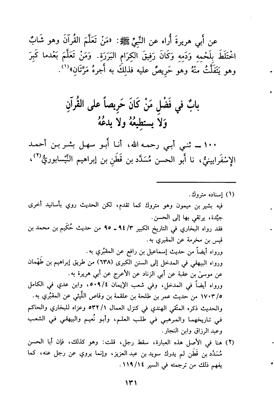 عَنْ أَبِي هُرَيْرَةَ، أَرَاهُ عَنِ النَّبِيِّ صَلَّى اللَّهُ عَلَيْهِ وَسَلَّمَ: «§مَنْ تَعَلَّمَ الْقُرْآنَ وَهُوَ شَابٌّ اخْتَلَطَ بِلَحْمِهِ وَدَمِهِ , وَكَانَ رَفِيقَ الْكِرَامِ الْبَرَرَةِ، وَمَنْ تَعَلَّمَ بَعْدَمَا كَبُرَ وَهُوَ يَتَفَلَّتُ مِنْهُ وَهُوَ حَرِيصٌ عَلَيْهِ , فَذَلِكَ بِهِ أَجْرُهُ مَرَّتَانِ»