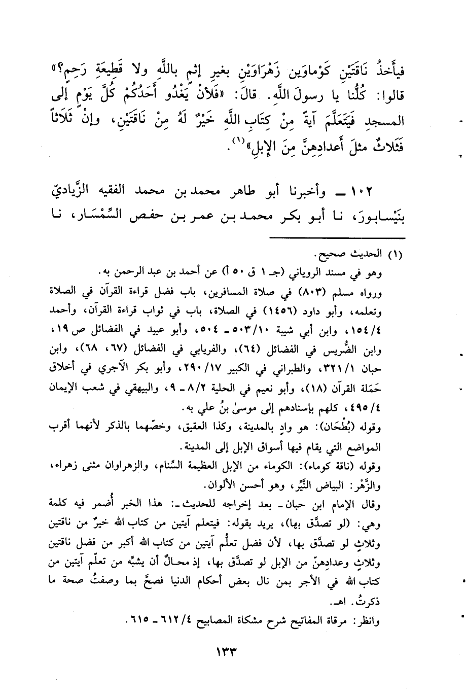 فَيَأْخُذَ نَاقَتَيْنِ كَوْمَاوَيْنِ زَهْرَاوَيْنِ بِغَيْرِ إِثْمٍ بِاللَّهِ وَلا قَطِيعَةِ رَحِمٍ؟» قَالُوا: كُلُّنَا يَا رَسُولَ اللَّهِ، قَالَ: §«فَلأَنْ يَغُدَو أَحَدُكُمْ كُلَّ يَوْمٍ إِلَى الْمَسْجِدِ فَيَتَعَلَّمَ آيَةً مِنْ كِتَابِ اللَّهِ خَيْرٌ لَهُ مِنْ نَاقَتَيْنِ، وَإِنَّ ثَلاثًا فَثَلاثٌ مِثْلُ أَعْدَادِهِنَّ مِنَ الإِبِلِ»