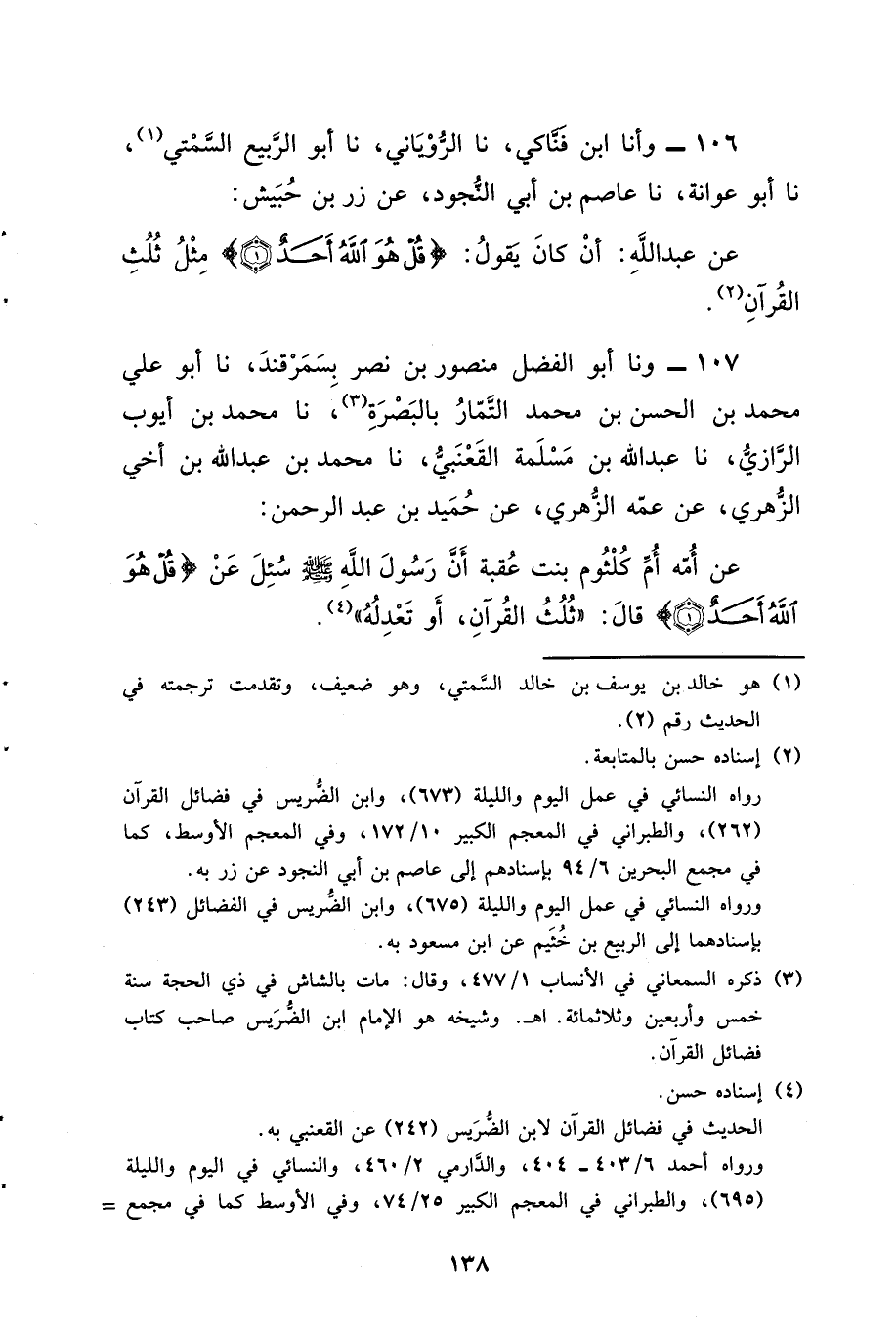 106 - وَأنا ابْنُ فناكي، نا الرُّويَانِيُّ، نا أَبُو الرَّبِيعِ السَّمْتِيُّ، نا أَبُو عَوَانَةَ، نا عَاصِمُ بْنُ أَبِي النَّجُودِ، عَنْ زِرِّ بْنِ حُبَيْشٍ، عَنْ عَبْدِ اللَّهِ، أَنَّهُ كَانَ يَقُولُ: «§قُلْ هُوَ اللَّهُ أَحَدٌ مِثْلُ ثُلُثَ الْقُرْآنِ»