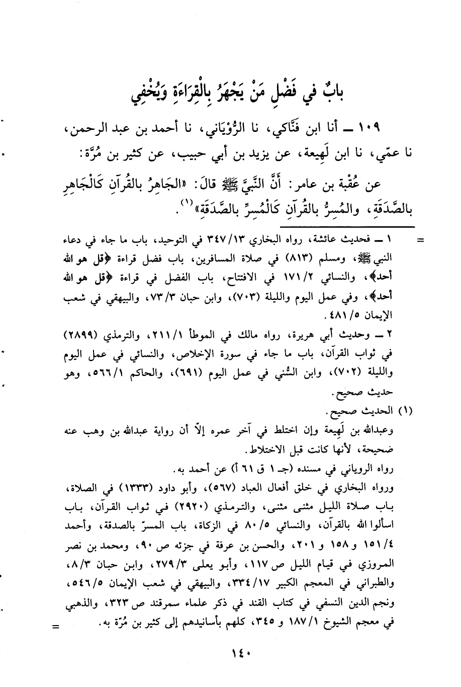 109 - أنا ابْنُ فناكي، نا الرُّويَانِيُّ، نا أَحْمَدُ بْنُ عَبْدِ الرَّحْمَنِ، نا عَمِّي، نا ابْنُ لَهِيعَةَ، عَنْ يَزِيدَ بْنِ أَبِي حَبِيبٍ، عَنْ كَثِيرِ بْنِ مُرَّةَ، عَنْ عُقْبَةَ بْنِ عَامِرٍ، أَنَّ النَّبِيَّ صَلَّى اللَّهُ عَلَيْهِ وَسَلَّمَ، قَالَ: «§الْجَاهِرُ بِالْقُرْآنِ كَالْجَاهِرِ بِالصَّدَقَةِ، وَالْمُسِرُّ بِالْقُرْآنِ كَالْمُسِرِّ بِالصَّدَقَةِ»