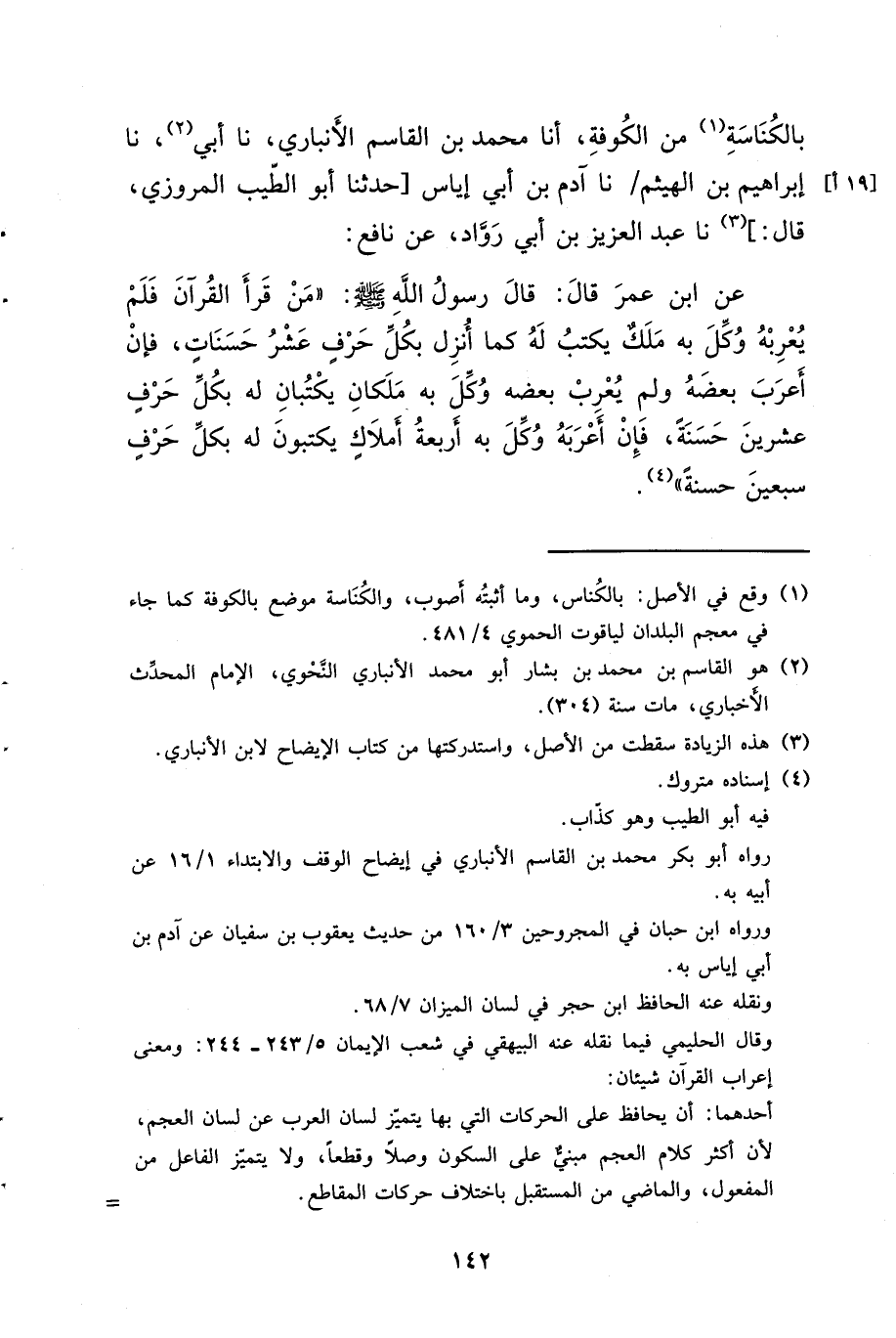 بِالْكُنَاسَةِ مِنَ الْكُوفَةِ، أنا مُحَمَّدُ بْنُ الْقَاسِمِ الأَنْبَارِيُّ، نا أَبِي، نا إِبْرَاهِيمُ بْنُ الْهَيْثَمِ، نا آدَمُ بْنُ أَبِي إِيَاسٍ، حَدَّثَنَا أَبُو الطَّيِّبِ الْمَرْوَزِيُّ، قَالَ: نا عَبْدُ الْعَزِيزِ بْنُ أَبِي رَوَّادٍ، عَنْ نَافِعٍ، عَنِ ابْنِ عُمَرَ، قَالَ: قَالَ رَسُولُ اللَّهِ صَلَّى اللَّهُ عَلَيْهِ وَسَلَّمَ: «§مَنْ قَرَأَ الْقُرْآنَ فَلَمْ يُعْرِبْهُ وُكِّلَ بِهِ مَلَكٌ يَكْتُبُ لَهُ كَمَا أُنْزِلَ بِكُلِّ حَرْفٍ عَشْرَ حَسَنَاتٍ، فَإِنْ أَعْرَبَ بَعْضَهُ وَلَمْ يُعْرِبْ بَعْضَهُ وُكِّلَ بِهِ مَلَكَانِ يَكْتُبَانِ لَهُ بِكُلِّ حَرْفٍ عِشْرِينَ حَسَنَةً، فَإِنْ أَعْرَبَهُ وُكِّلَ بِهِ أَرْبَعَةُ أَمْلاكٍ يَكْتُبُونَ لَهُ بِكُلِّ حَرْفٍ سَبْعِينَ حَسَنَةً»