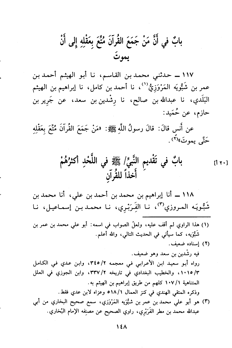 117 - حدَّثَنِي مُحَمَّدُ بْنُ الْقَاسِمِ، نا أَبُو الْهَيْثَمِ أَحْمَدُ بْنُ عُمَرَ بْنِ شَبُّويَه الْمَرْوَزِيُّ، نا أَحْمَدُ بْنُ كَامِلٍ، نا إِبْرَاهِيمُ بْنُ الْهَيْثَمِ الْبَلَدِيُّ، نا عَبْدُ اللَّهِ بْنُ صَالِحٍ، نا رِشْدِينُ بْنُ سَعْدٍ، عَنْ جَرِيرِ بْنِ حَازِمٍ، عَنْ حُمَيْدٍ، عَنْ أَنَسٍ، قَالَ: قَالَ رَسُولُ اللَّهِ صَلَّى اللَّهُ عَلَيْهِ وَسَلَّمَ: «§مَنْ جَمَعَ الْقُرْآنَ مُتِّعَ بِعَقْلِهِ حَتَّى يَمُوتَ»
