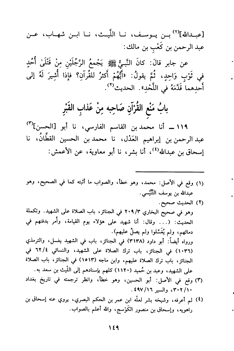 نا عَبْدُ اللَّهِ بْنُ يُوسُفَ، نا اللَّيْثُ، نا ابْنُ شِهَابٍ، عَنْ عَبْدِ الرَّحْمَنِ بْنِ كَعْبِ بْنِ مَالِكٍ، عَنْ جَابِرٍ، قَالَ: كَانَ النَّبِيُّ صَلَّى اللَّهُ عَلَيْهِ وَسَلَّمَ " §يَجْمَعُ الرَّجُلَيْنِ مِنْ قَتْلَى أُحُدٍ فِي ثَوْبٍ وَاحِدٍ، ثُمَّ يَقُولُ: «أَيُّهُمْ أَكْثَرُ لِلْقُرْآنِ؟ فَإِذَا أُشِيرَ لَهُ إِلَى أَحَدِهِمَا قَدَّمَهُ فِي اللَّحْدِ».