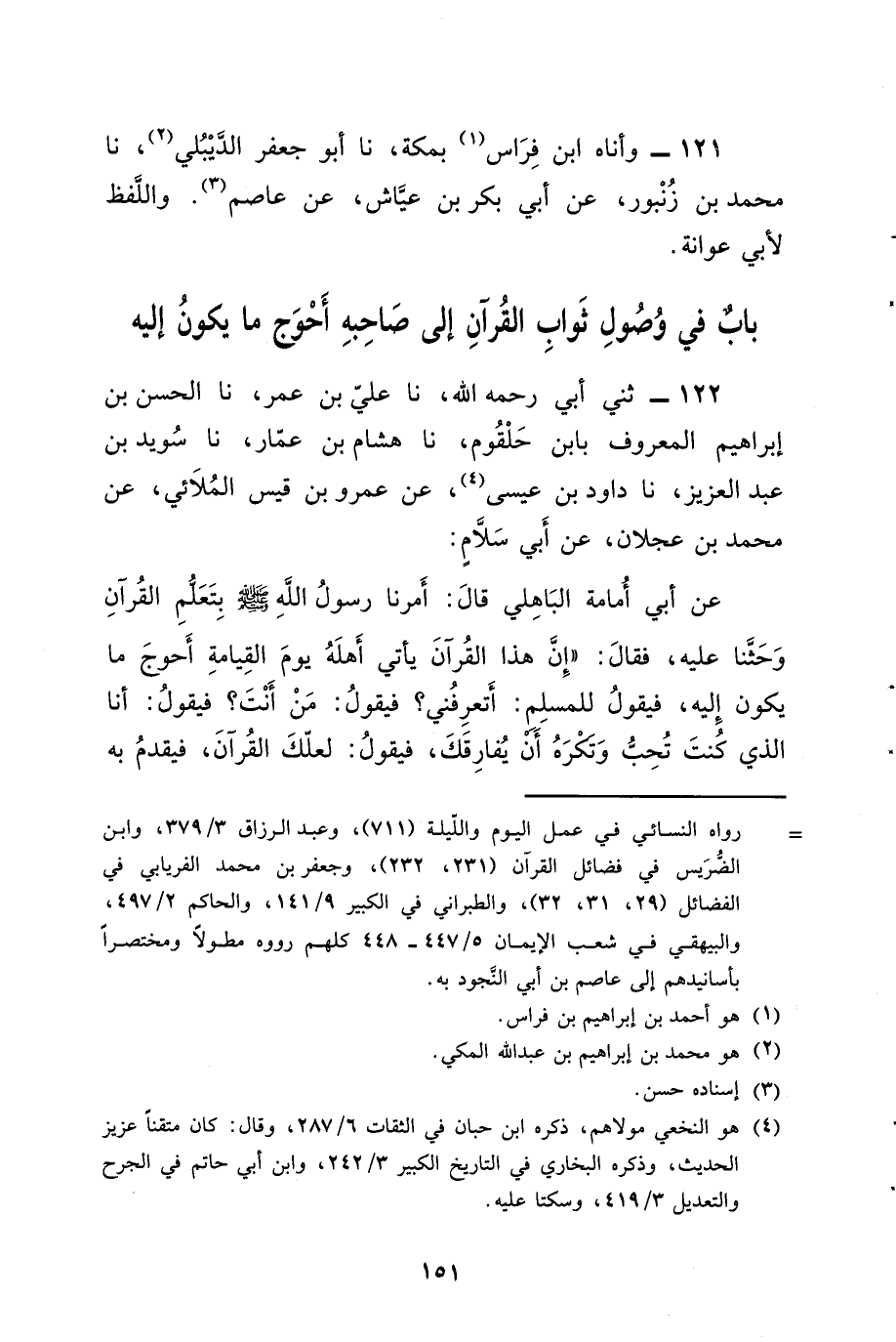 122 - ثني أَبِي رَحِمَهُ اللَّهُ، نا عَلِيُّ بْنُ عُمَرَ، نا الْحَسَنُ بْنُ إِبْرَاهِيمَ الْمَعْرُوفُ بِابْنِ حلقوم، نا هِشَامُ بْنُ عَمَّارٍ، نا سُوَيْدُ بْنُ عَبْدِ الْعَزِيزِ، نا دَاوُدُ بْنُ عِيسَى، عَنْ عَمْرِو بْنِ قَيْسٍ الْمُلائِيِّ، عَنْ مُحَمَّدِ بْنِ عَجْلانَ، عَنْ أَبِي سَلامٍ، عَنْ أَبِي أُمَامَةَ الْبَاهِلِيِّ، قَالَ: § «أَمَرَنَا رَسُولُ اللَّهِ صَلَّى اللَّهُ عَلَيْهِ وَسَلَّمَ بِتَعَلُّمِ الْقُرْآنِ، وَحثنا عَلَيْهِ»، فَقَالَ: " إِنَّ هَذَا الْقُرْآنَ يَأْتِي أَهْلَهُ يَوْمَ الْقِيَامَةِ أَحْوَجَ مَا يَكُونُ إِلَيْهِ، فَيَقُولُ لِلْمُسْلِمِ: أَتَعْرِفُنِي؟، فَيَقُولُ: مَنْ أَنْتَ؟، فَيَقُولُ: أَنَا الَّذِي كُنْتُ تُحِبُّ، وَتَكْرَهُ أَنْ يُفَارِقَكَ، فَيَقُولُ: لَعَلَّكَ الْقُرْآنُ، فَيَقْدَمُ بِهِ