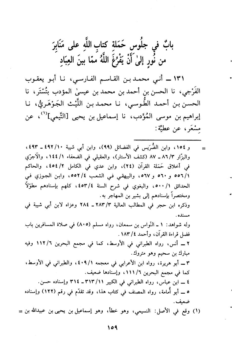 131 - أني مُحَمَّدُ بْنُ الْقَاسِمِ الْفَارِسِيُّ، نا أَبُو يَعْقُوبَ الْفَرَجِيُّ، نا الْحَسَنُ بْنُ أَحْمَدَ بْنِ مُحَمَّدِ بْنِ عِيسَى الْمُؤَدِّبُ، بِتُسْتَرَ، نا الْحَسَنُ بْنُ أَحْمَدَ الطُّوسِيُّ، نا مُحَمَّدُ بْنُ اللَّيْثِ الْجَوْهَرِيُّ، نا إِبْرَاهِيمُ بْنُ مُوسَى الْمُؤَدِّبُ، نا إِسْمَاعِيلُ بْنُ يَحْيَى التَّيْمِيُّ، عَنْ مِسْعَرٍ، عَنْ عَطِيَّةَ،