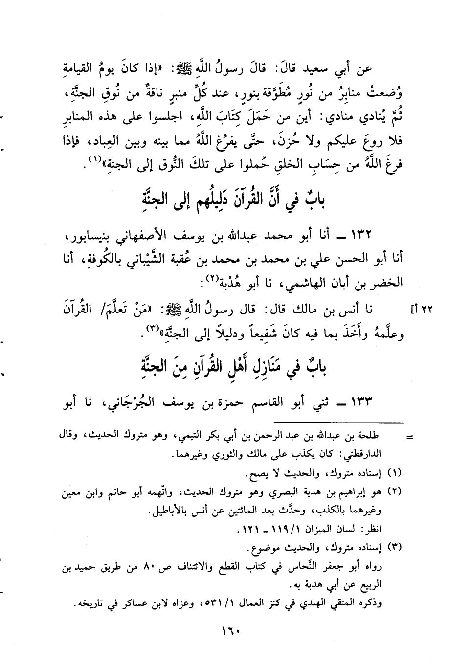 132 - أنا أَبُو مُحَمَّدٍ عَبْدُ اللَّهِ بْنُ يُوسُفَ الأَصْفَهَانِيُّ بِنَيْسَابُورَ، أنا أَبُو الْحَسَنِ عَلِيُّ بْنُ مُحَمَّدِ بْنِ مُحَمَّدِ بْنِ عُقْبَةَ الشَّيْبَانِيُّ بِالْكُوفَةِ، أنا الْخَضِرُ بْنُ أَبَانٍ الْهَاشِمِيُّ، نا أَبُو هُدْبَةَ، نا أَنَسُ بْنُ مَالِكٍ، قَالَ: قَالَ رَسُولُ اللَّهِ صَلَّى اللَّهُ عَلَيْهِ وَسَلَّمَ: «§مَنْ تَعَلَّمَ الْقُرْآنَ وَعَلَّمَهُ، وَأَخَذَ بِمَا فِيهِ، كَانَ شَفِيعًا وَدَلِيلا إِلَى الْجَنَّةِ»