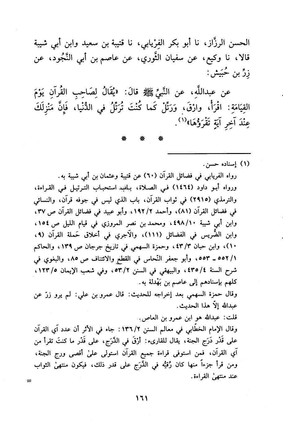 الْحَسَنِ الرَّزَّازُ، نا أَبُو بَكْرٍ الْفِرْيَابِيُّ، نا قُتَيْبَةُ بْنُ سَعِيدٍ، وَابْنُ أَبِي شَيْبَةَ، قَالا: نا وَكِيعٌ، عَنْ سُفْيَانَ الثَّوْرِيِّ، عَنْ عَاصِمِ بْنِ أَبِي النَّجُودِ، عَنْ زِرِّ بْنِ حُبَيْشٍ، عَنْ عَبْدِ اللَّهِ، عَنِ النَّبِيِّ صَلَّى اللَّهُ عَلَيْهِ وَسَلَّمَ، قَالَ: " §يُقَالُ لِصَاحِبِ الْقُرْآنِ يَوْمَ الْقِيَامَةِ: اقْرَأْ، وَارْقَ، وَرَتِّلْ كَمَا كُنْتَ تُرَتِّلُ فِي الدُّنْيَا، فَإِنَّ مَنْزِلَكَ عِنْدَ آخِرِ آيَةٍ تَقْرَؤُهَا "