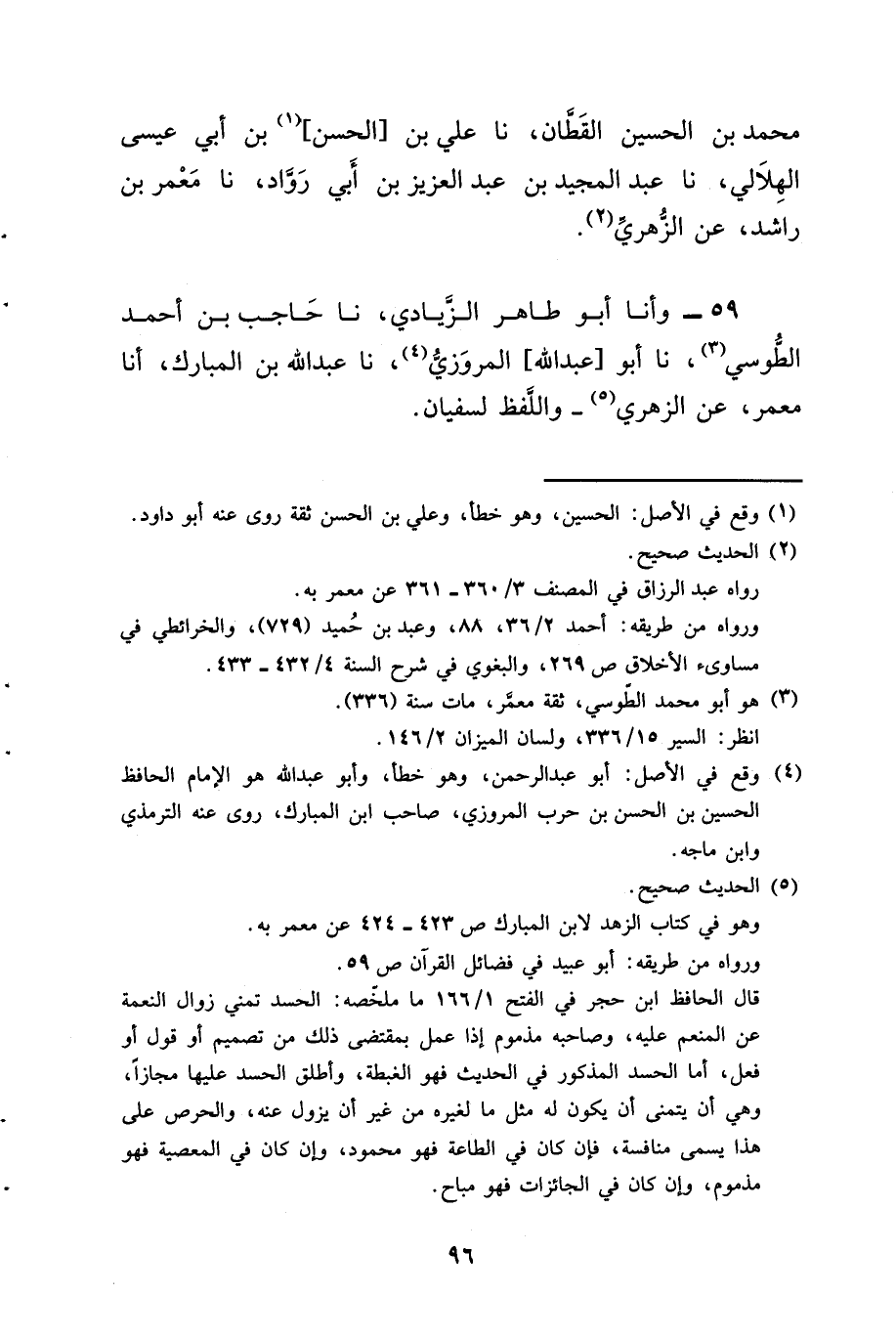 59 - وَأنا أَبُو طَاهِرٍ الزِّيَادِيُّ، نا حَاجِبُ بْنُ أَحْمَدَ الطُّوسِيُّ، نا أَبُو عَبْدِ اللَّهِ الْمَرْوَزِيُّ، نا عَبْدُ اللَّهِ بْنُ الْمُبَارَكِ، أنا مَعْمَرٌ، عَنِ الزُّهْرِيِّ، وَاللَّفْظُ لِسُفْيَانَ
