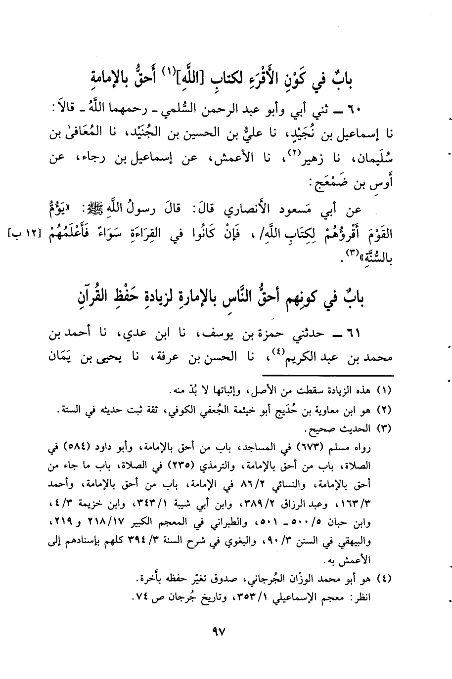 60 - ثني أَبِي , وَأَبُو عَبْدِ الرَّحْمَنِ السُّلَمِيُّ رَحِمَهُمَا اللَّهُ، قَالا: نا إِسْمَاعِيلُ بْنُ نُجَيْدٍ، نا عَلِيُّ بْنُ الْحُسَيْنِ بْنِ الْجُنَيْدِ، نا الْمُعَافَى بْنُ سُلَيْمَانَ، نا زُهَيْرٌ، نا الأَعْمَشُ، عَنْ إِسْمَاعِيلَ بْنِ رَجَاءٍ، عَنْ أَوْسِ بْنِ ضَمْعَجٍ، عَنْ أَبِي مَسْعُودٍ الأَنْصَارِيِّ، قَالَ: قَالَ رَسُولُ اللَّهِ صَلَّى اللَّهُ عَلَيْهِ وَسَلَّمَ: «§يَؤُمُّ الْقَوْمُ أَقْرَؤُهُمْ لِكِتَابِ اللَّهِ، فَإِنْ كَانُوا فِي الْقِرَاءَةِ سَوَاءً فَأَعْلَمُهُمْ بِالسُّنَّةِ»