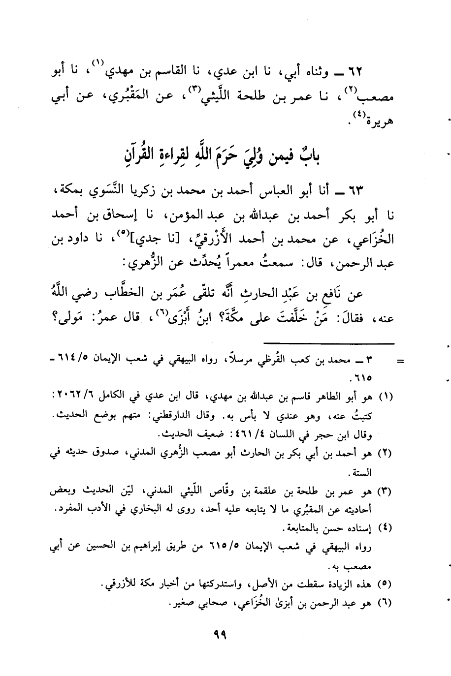 62 - وَثناه أَبِي، نا ابْنُ عَدِيٍّ، نا الْقَاسِمُ بْنُ مَهْدِيٍّ، نا أَبُو مُصْعَبٍ، نا عُمَرُ بْنُ طَلْحَةَ اللَّيْثِيُّ، عَنِ الْمَقْبُرِيِّ، عَنْ أَبِي هُرَيْرَةَ