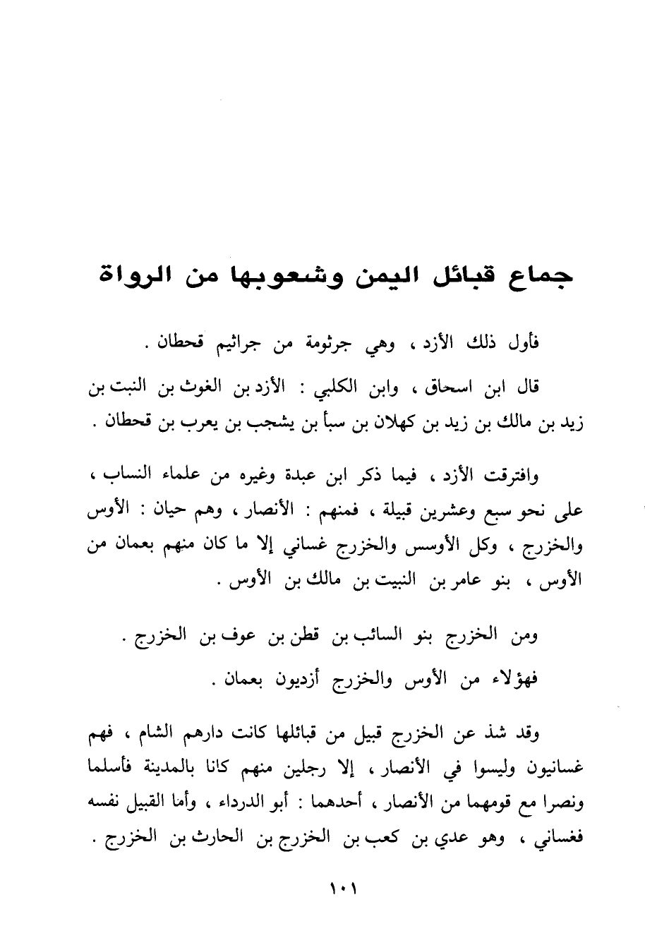 وافترقت الأزد فِيمَا ذكر ابْن عَبدة وَغَيره من عُلَمَاء الْأَنْسَاب على نَحْو سبع وَعشْرين قَبيلَة فَمنهمْ الْأَنْصَار وهم حَيَّان الْأَوْس والخزرج وكل الْأَوْس والخزرج غساني إِلَّا مَا كَانَ مِنْهُم بعمان من الْأَوْس بَنو عَامر بن النبيت بن مَالك بن الْأَوْس