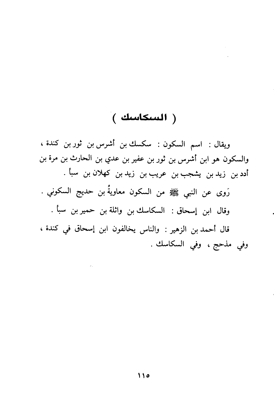 وَيُقَال اسْم السّكُون سكسك بن أَشْرَس بن ثَوْر بن كِنْدَة والسكون هُوَ ابْن أَشْرَس بن ثَوْر بن عفير بن عدي بن الْحَارِث بن مرّة بن أدد بن زيد بن يشجب بن عريب بن زيد بن كهلان بن سبأ