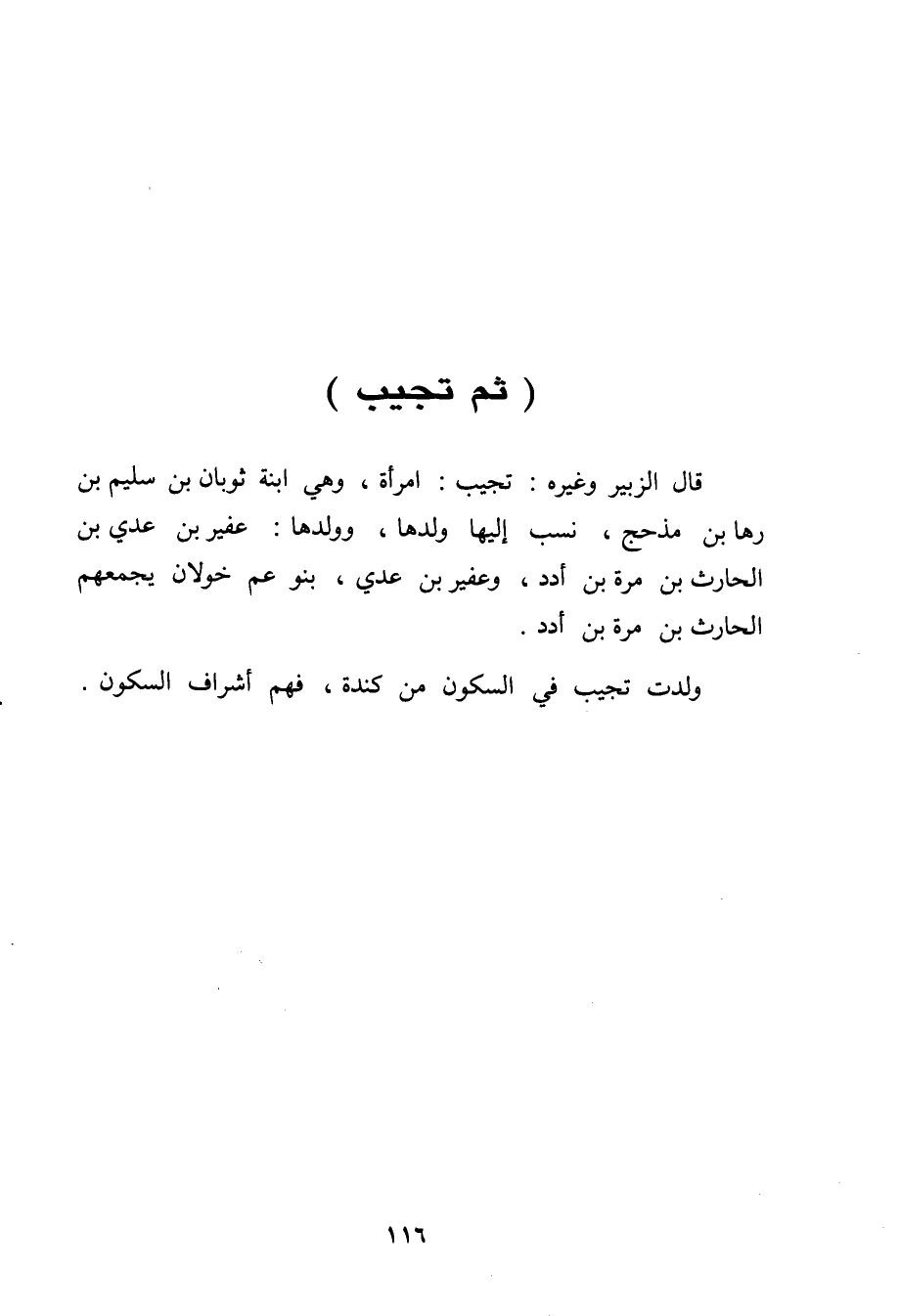 قَالَ الزبير وَغَيره تجيب امْرَأَة وَهِي ابْنة ثَوْبَان بن سليم بن رها بن مذْحج نسب إِلَيْهَا وَلَدهَا وَوَلدهَا عفير بن عدي بن الْحَارِث بن مرّة بن أدد وعفير بن عدي بَنو عَم خولان يجمعهُمْ الْحَارِث بن مرّة بن أدد