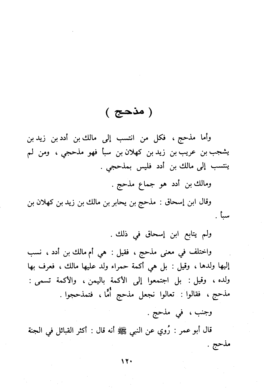 وَأما مذْحج فَكل من انتسب إِلَى مَالك بن أدد بن زيد بن يشجب بن عريب بن زيد بن كهلان بن سبأ فَهُوَ مذحجي وَمن لم ينتسب إِلَى مَالك بن أدد فَلَيْسَ بمذحجي