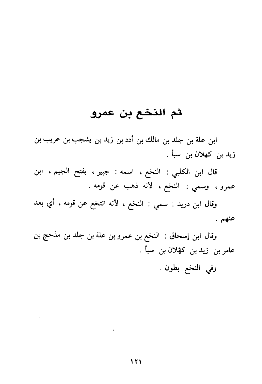 وَقَالَ ابْن إِسحاق النخع بن عَمْرو بن عِلّة بن جلد بن مذْحج بن عَامر بن زيد بن كهلان بن سبأ