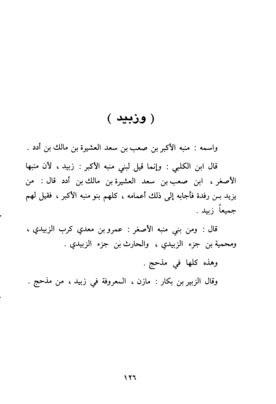 قَالَ ابْن الْكَلْبِيّ وَإِنَّمَا قيل لبني مُنَبّه الْأَكْبَر زبيد لِأَن منبها الأصغَر ابْن صَعب بن سعد الْعَشِيرَة بن مَالك بن أدد قَالَ من يزِيد بن رفدة فَأَجَابَهُ إِلَى ذَلِك أَعْمَامه كلهم بَنو مُنَبّه الْأَكْبَر فَقيل لَهُم جَمِيعًا زبيد