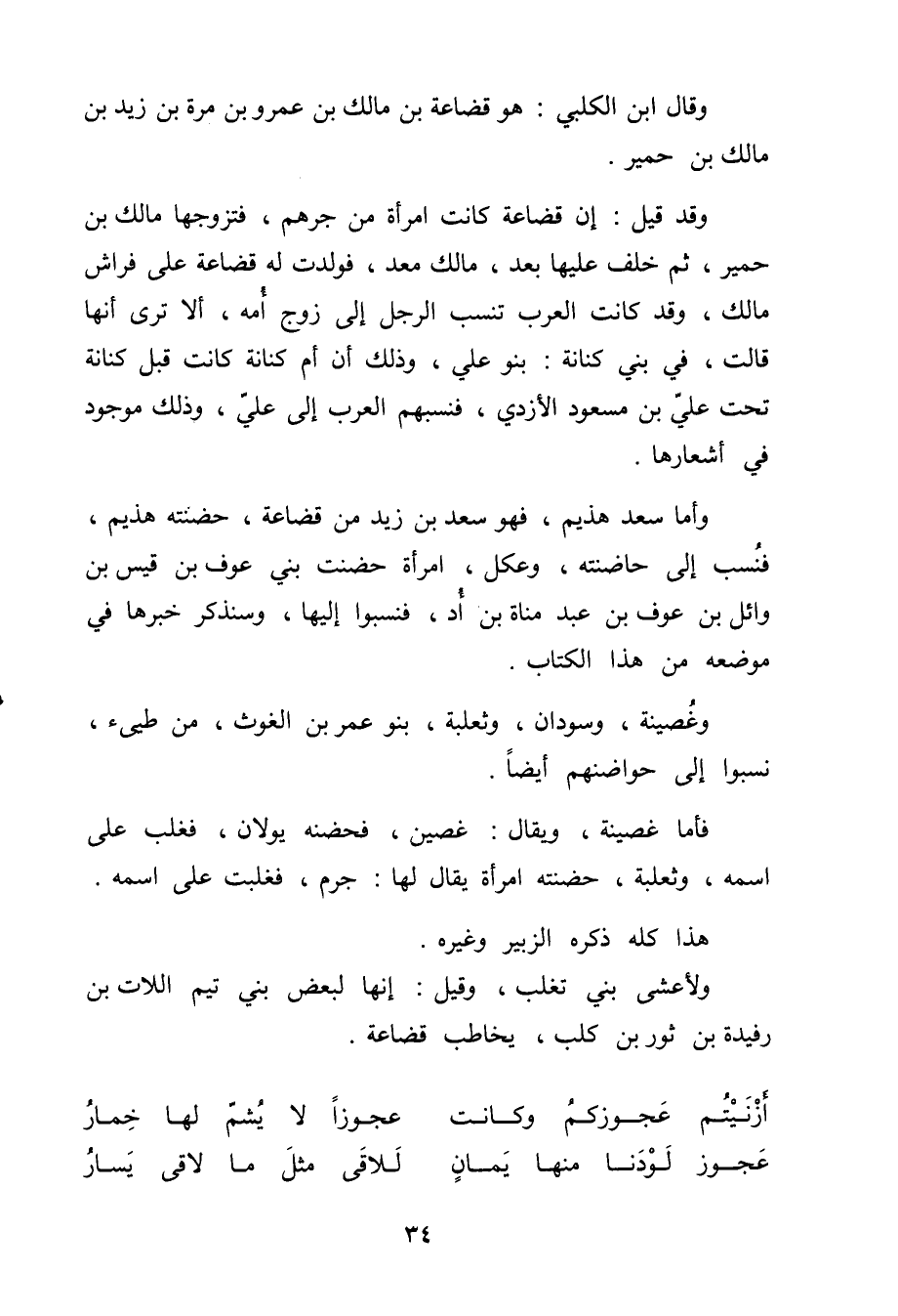 وَقد قيل إِن قضاعة كَانَت امْرَأَة من جرهم فَتَزَوجهَا مَالك بن حمير ثمَّ خلف عَلَيْهَا بعد مَالك معد فَولدت لَهُ قضاعة على فرَاش مَالك وَقد كَانَت الْعَرَب تنْسب الرجل إِلَى زوج أمه أَلا ترى أَنَّهَا قَالَت فِي بني كنَانَة بَنو عَليّ وَذَلِكَ أَن أم كنَانَة كَانَت قبل كنَانَة تَحت عَليّ بنت مَسْعُود الْأَزْدِيّ فنسبهم الْعَرَب إِلَى عَليّ وَذَلِكَ مَوْجُود فِي أشعارها