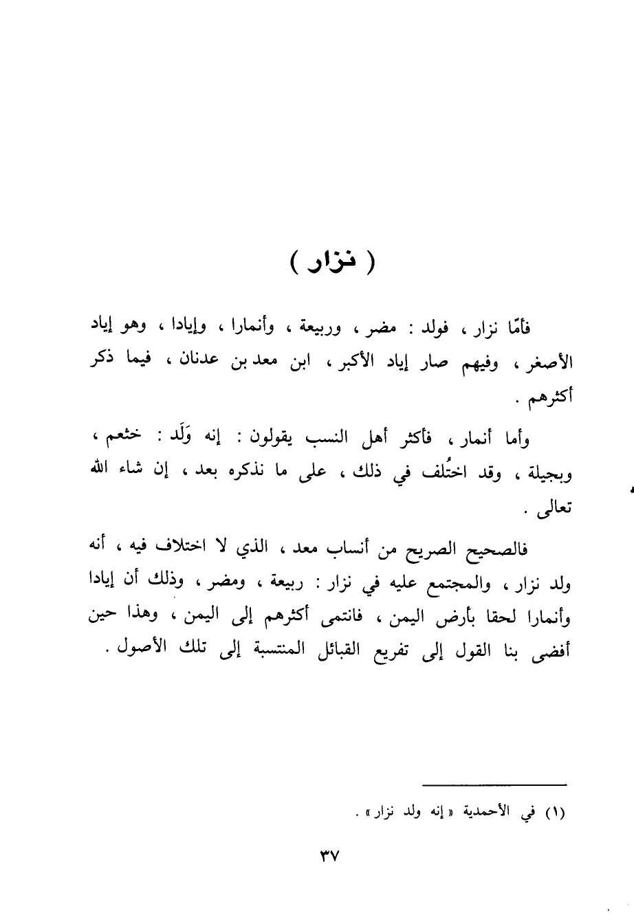 فَالصَّحِيح الصَّرِيح من أَنْسَاب معد الَّذِي لَا اخْتِلَاف فِيهِ أَنه ولد نزار والمجتمع عَلَيْهِ فِي نزار ربيعَة وَمُضر وَذَلِكَ أَن إيادا وأنمارا لَحقا بِأَرْض الْيمن فانتمى أَكْثَرهم إِلَى الْيمن وَهَذَا حِين أفْضى بِنَا القَوْل إِلَى تَفْرِيع الْقَبَائِل المنتسبة إِلى تِلْكَ الْأُصُول