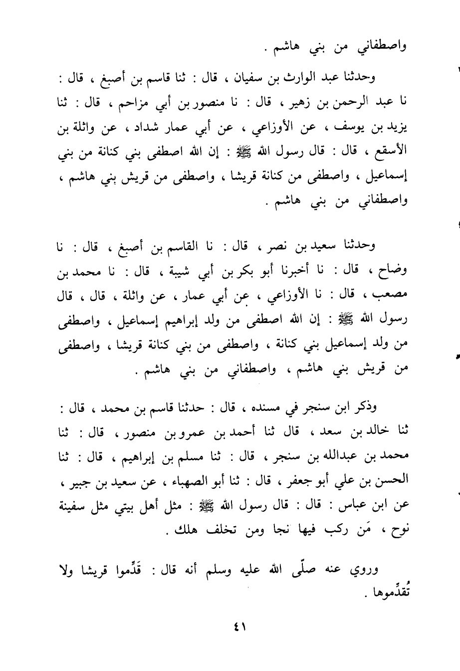 وَحدثنَا عبد الْوَارِث بن سُفْيَان قَالَ ثَنَا قَاسم بن أصبغ قَالَ نَا عبد الرَّحْمَن بن زُهَيْر قَالَ نَا مَنْصُور بن أبي مُزَاحم قَالَ ثَنَا يزِيد بن يُوسُف عَن الْأَوْزَاعِيّ عَن أبي عمار شَدَّاد عَن وَاثِلَة بن الْأَسْقَع قَالَ قَالَ رَسُول الله صلى الله عَلَيْهِ وَسلم إِن الله اصْطفى من قُرَيْش بني هَاشم وَاصْطَفَانِي من بني هَاشم