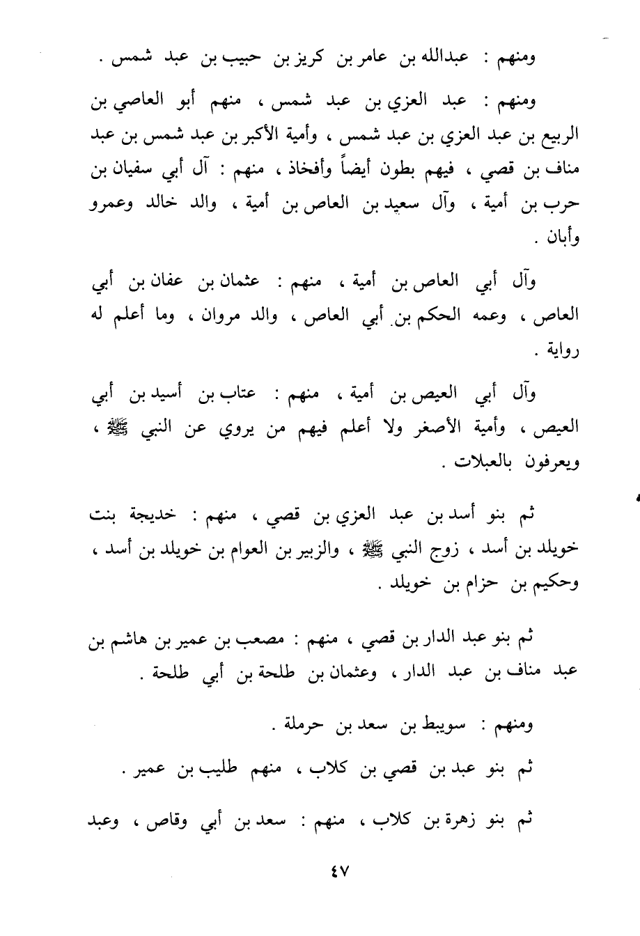 وَمِنْهُم عبد الْعزي بن عبد شمس مِنْهُم أَبُو العَاصِي بن الرّبيع بن عبد الْعزي بن عبد شمس وَأُميَّة الْأَكْبَر بن عبد شمس بن عبد منَاف بن قصى فيهم بطُون أَيْضا وأفخاذ مِنْهُم آل أبي سُفْيَان بن حَرْب بن أُميَّة وَآل سعيد بن الْعَاصِ بن أُميَّة وَالِد خَالِد وَعَمْرو وَأَبَان