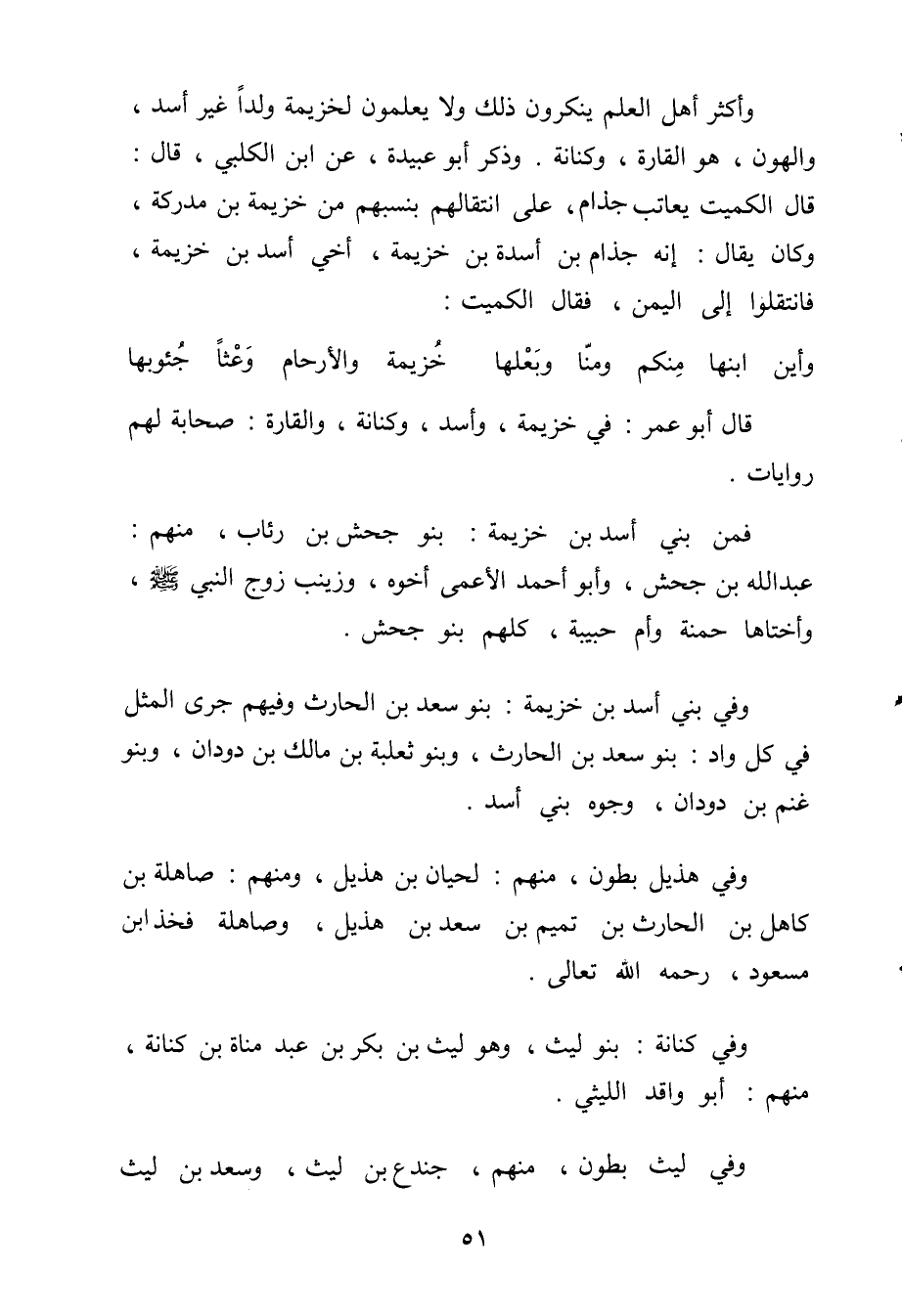 وَأكْثر أهل الْعلم يُنكرُونَ ذَلِك وَلَا يعلمُونَ لخزيمة ولدا غير أَسد والهون هُوَ القارة وكنانة وَذكر أَبُو عُبَيْدَة عَن ابْن الْكَلْبِيّ قَالَ قَالَ الْكُمَيْت يُعَاتب جذام على انتقالهم بنسبهم من خُزَيْمَة بن مدركة وَكَانَ يُقَال إِنَّه جذام بن أسدة بن خُزَيْمَة أخي أَسد بن خُزَيْمَة فانتقلوا إِلَى الْيمن فَقَالَ الْكُمَيْت