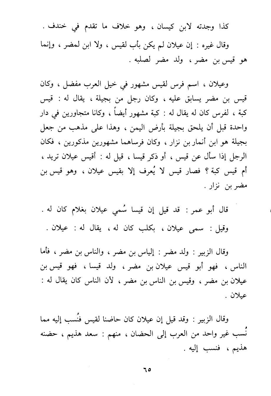 وَقَالَ الزبير وَقد قيل إِن عيلان كَانَ حاضنا لقيس فنسب إِلَيْهِ مِمَّا نسب غير وَاحِد من الْعَرَب إِلَى الحضان مِنْهُم سعد هذيم حضنه هذيم فنسب إِلَيْهِ