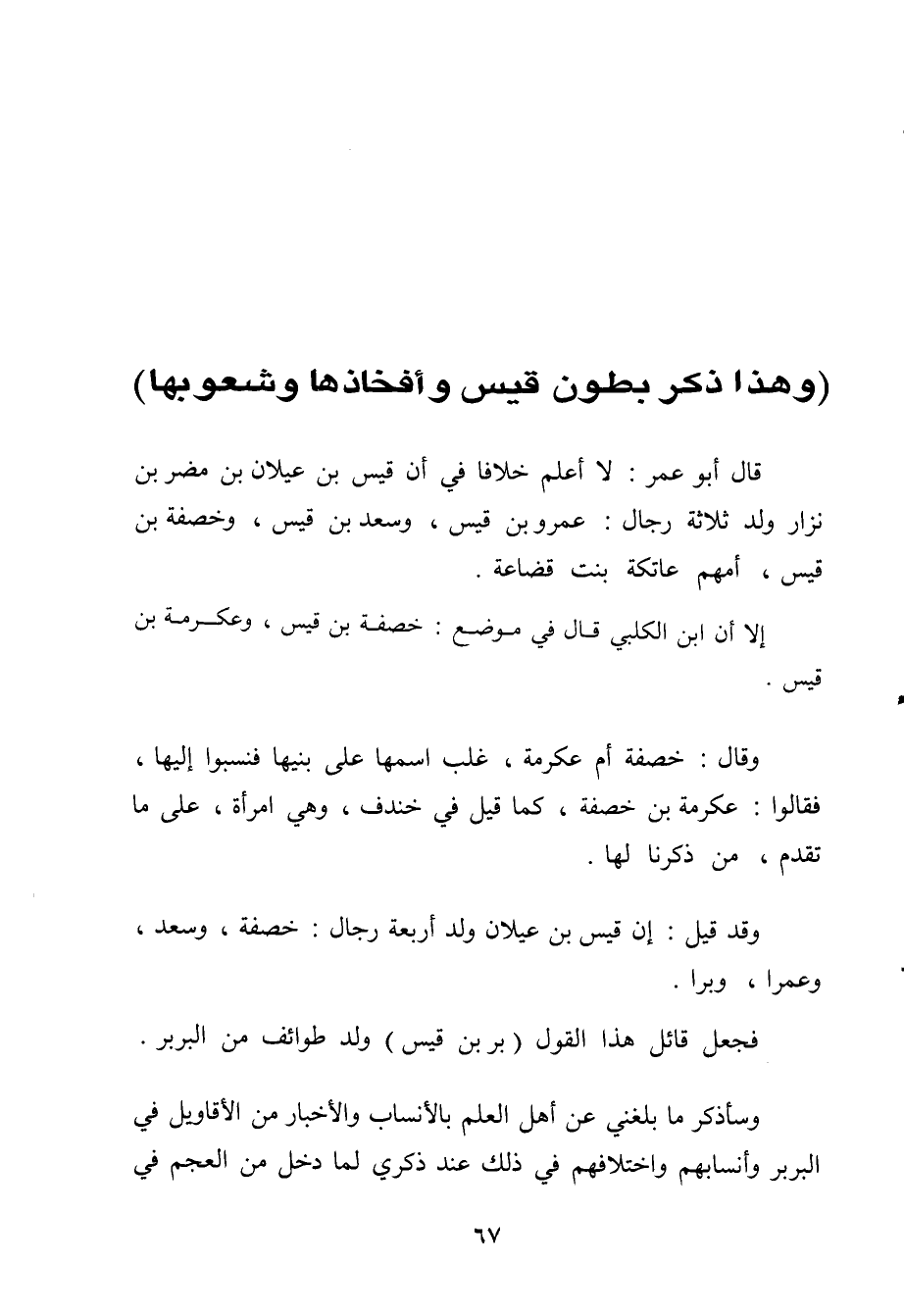 وسأذكر مَا بَلغنِي عَن أهل الْعلم بالأنساب وَالْأَخْبَار من الْأَقَاوِيل فِي البربر وأنسابهم وَاخْتِلَافهمْ فِي ذَلِك عِنْد ذكري لما دخل من الْعَجم فِي