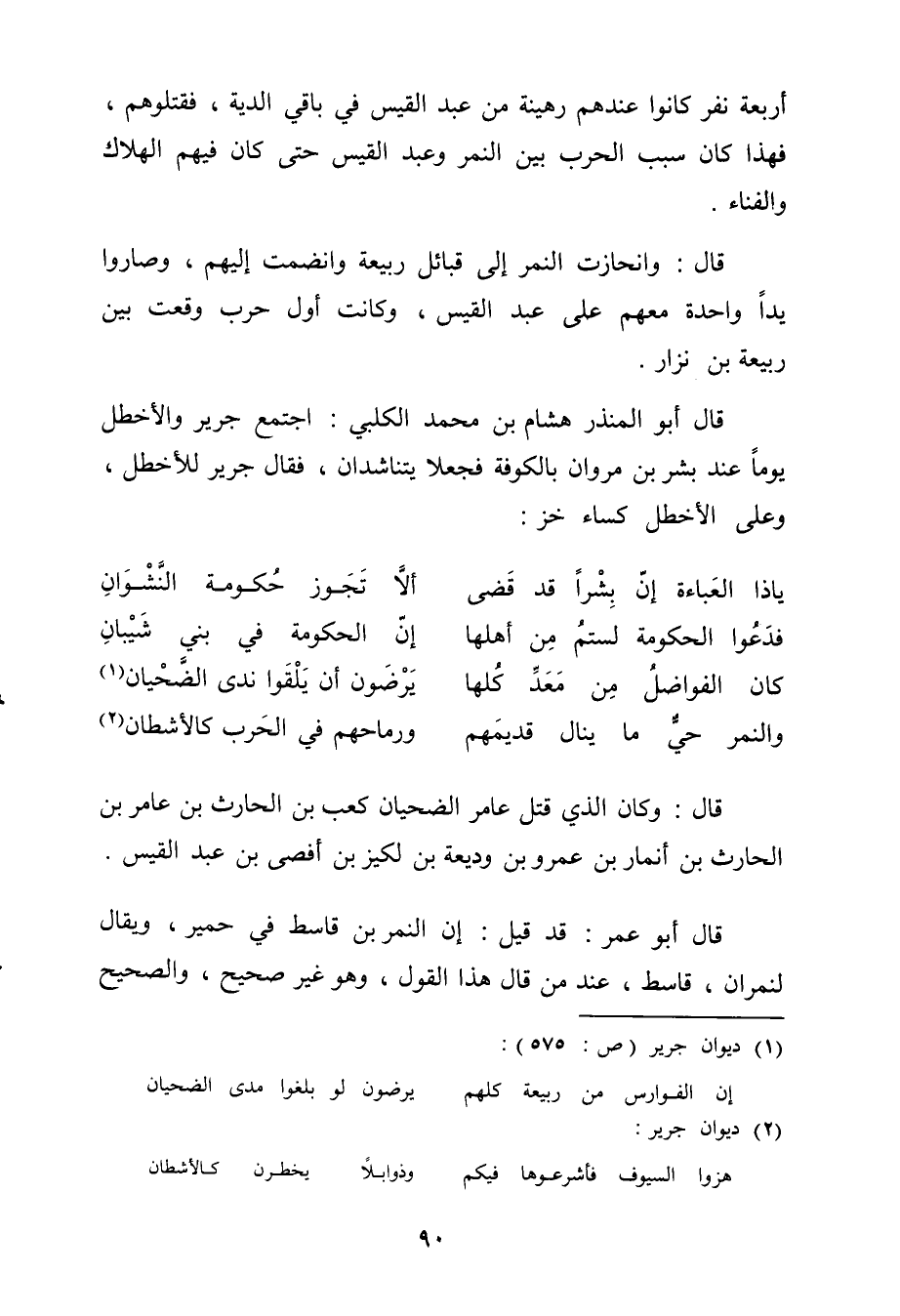 قَالَ أَبُو الْمُنْذر هِشَام بن مُحَمَّد الْكَلْبِيّ اجْتمع جرير والأخطل يَوْمًا عِنْد بشر بن مَرْوَان بِالْكُوفَةِ فَجعلَا يتناشدان فَقَالَ جرير للأخطل وعَلى الأخطل كسَاء خَز