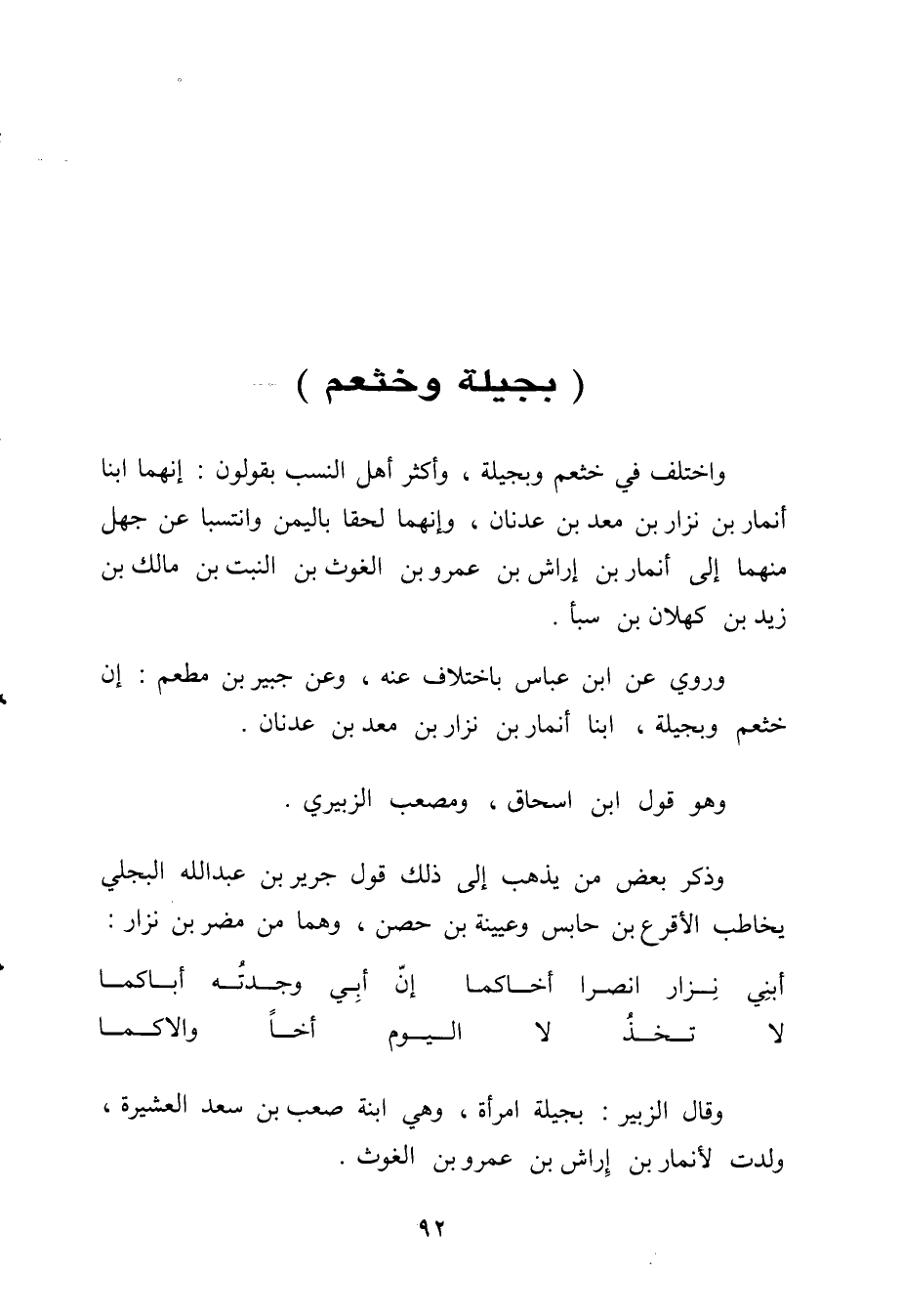 وَرُوِيَ عَن ابْن عَبَّاس باخْتلَاف عَنهُ وَعَن جُبَير بن مطعم إِن خثعم وبجيلة ابْنا أَنْمَار بن نزار بن معد بن عدنان