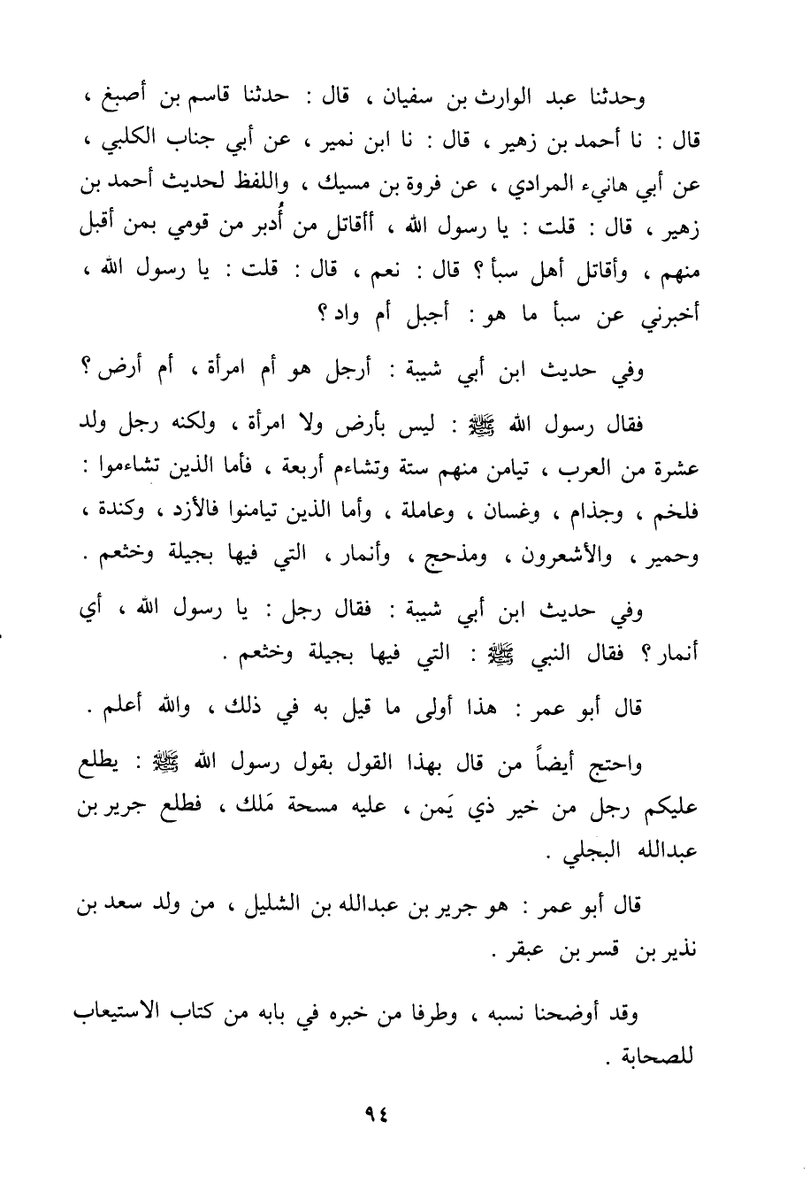 وَحدثنَا عبد الْوَارِث بن سُفْيَان قَالَ حَدثنَا قَاسم بن أصبغ قَالَ نَا أَحْمد بن زُهَيْر قَالَ نَا ابْن نمير عَن أبي جناب الْكَلْبِيّ عَن أبي هَانِيء الْمرَادِي عَن فَرْوَة بن مسيك وَاللَّفْظ لحَدِيث أَحْمد بن زُهَيْر قَالَ قلت يَا رَسُول الله أأقاتل من أُدبر من قومِي بِمن أقبل مِنْهُم وأقاتل أهل سبأ قَالَ نعم قَالَ قلت يَا رَسُول الله أَخْبرنِي عَن سبأ مَا هُوَ أجبل أم وَاد