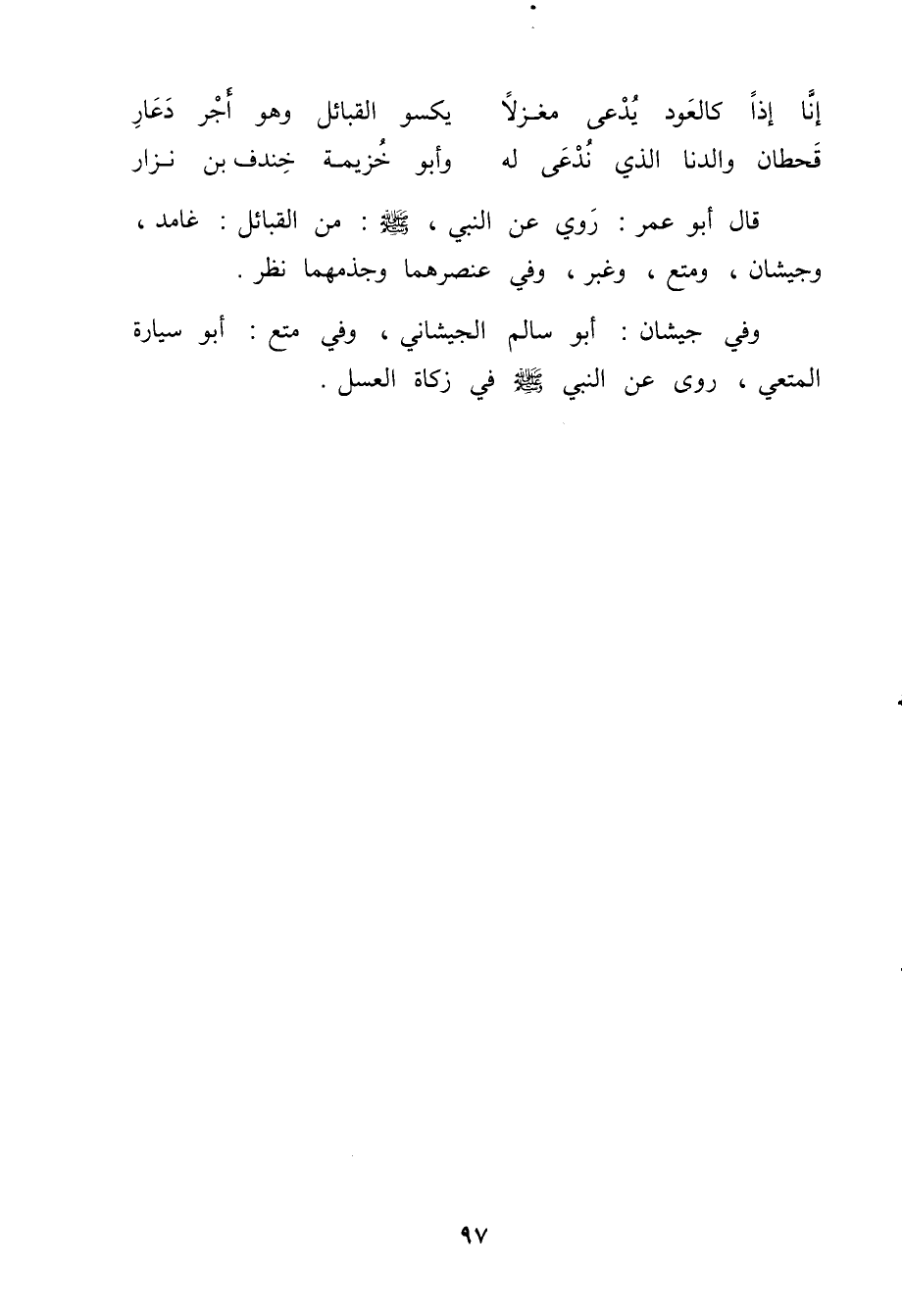 قَالَ أَبُو عمر رُوِيَ عَن النَّبِي صلى الله عَلَيْهِ وَسلم من الْقَبَائِل غامد وجيشان ومتع وغبر وَفِي عنصرهما وجذمهما نظر