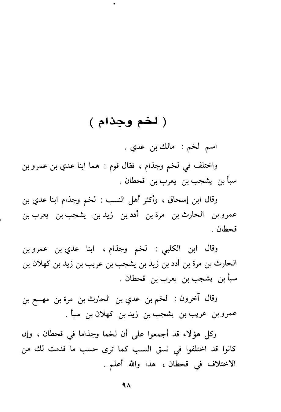 وكل هَؤُلَاءِ قد أَجمعُوا على أَن لخما وجذاما فِي قحطان وَإِن كَانُوا قد اخْتلفُوا فِي نسق النّسَب كَمَا ترى حسب مَا قدمت لَك من الِاخْتِلَاف فِي قحطان هَذَا وَالله أعلم