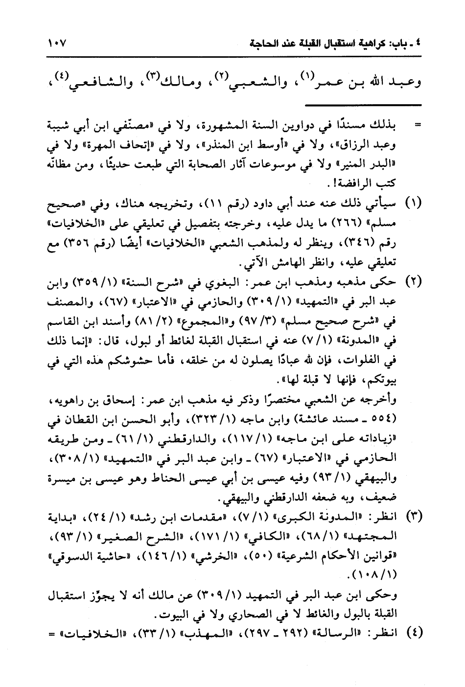 (¬2) حكى مذهبه ومذهب ابن عمر: البغوي في "شرح السنة" (1/ 359) وابن عبد البر في "التمهيد" (1/ 309) والحازمي في "الاعتبار" (67)، والمصنف في "شرح صحيح مسلم" (3/ 97) و"المجموع" (2/ 81) وأسند ابن أبو القاسم في "المدونة" (1/ 7) عنه في استقبال القبلة لغائط أو لبول، قال: "إنما ذلك في الفلوات، فإن لله عبادًا يصلون له من خلقه، فأما حشوشكم هذه التي في بيوتكم، فإنها لا قبلة لها".