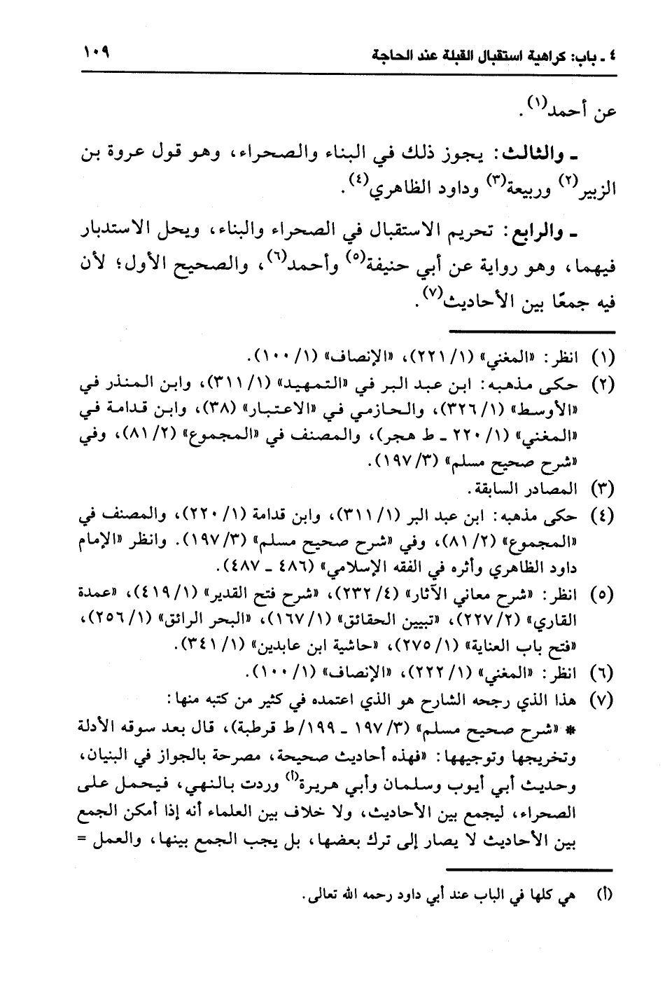 * "شرح صحيح مسلم" (3/ 197 - 199/ ط قرطبة)، قال بعد سوقه الأدلة وتخريجها وتوجيهها: "فهذه أحاديث صحيحة، مصرحة بالجواز في البنيان، وحديث أبي أيوب وسلمان وأبي هريرة (أ) وردت بالنهي، فيحمل على الصحراء، ليجمع بين الأحاديث، ولا خلاف بين العلماء أنه إذا أمكن الجمع بين الأحاديث لا يصار إلى ترك بعضها، بل يجب الجمع بينها، والعمل =