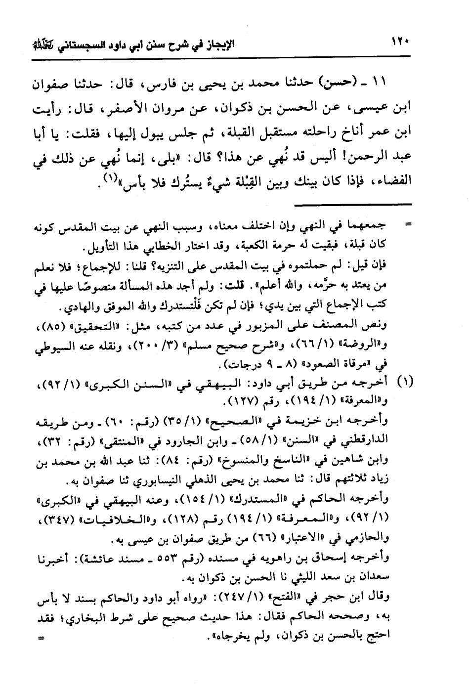 11 - (حسن) حدثنا محمد بن يحيى بن فارس، قال: حدثنا صفوان ابن عيسى، عن الحسن بن ذكران، عن مروان الأصفر، قال: رأيت ابن عمر أناخ راحلته مستقبل القبلة، ثم جلس يبول إليها، فقلت: يا أبا عبد الرحمن! أليس قد نُهي عن هذا؟ قال: "بلى، إنما نُهي عن ذلك في الفضاء، فإذا كان بينك وبين القِبْلة شيءٌ يستُرك فلا بأس" (¬1).