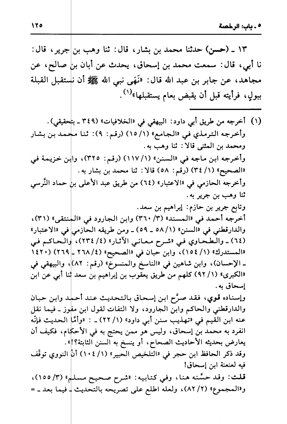13 - (حسن) حدثنا محمد بن بشار، قال: ثنا وهب بن جرير، قال: نا أبي، قال: سمعت محمد بن إسحاق، يحدث عن أبان بن صالح، عن مجاهد، عن جابر بن أبو عبد الله قال: "نَهَى نبي الله - صلى الله عليه وسلم - أن نستقبل القبلة ببولٍ، فرأيته قبل أن يقبض بعام يستقبلها" (¬1).