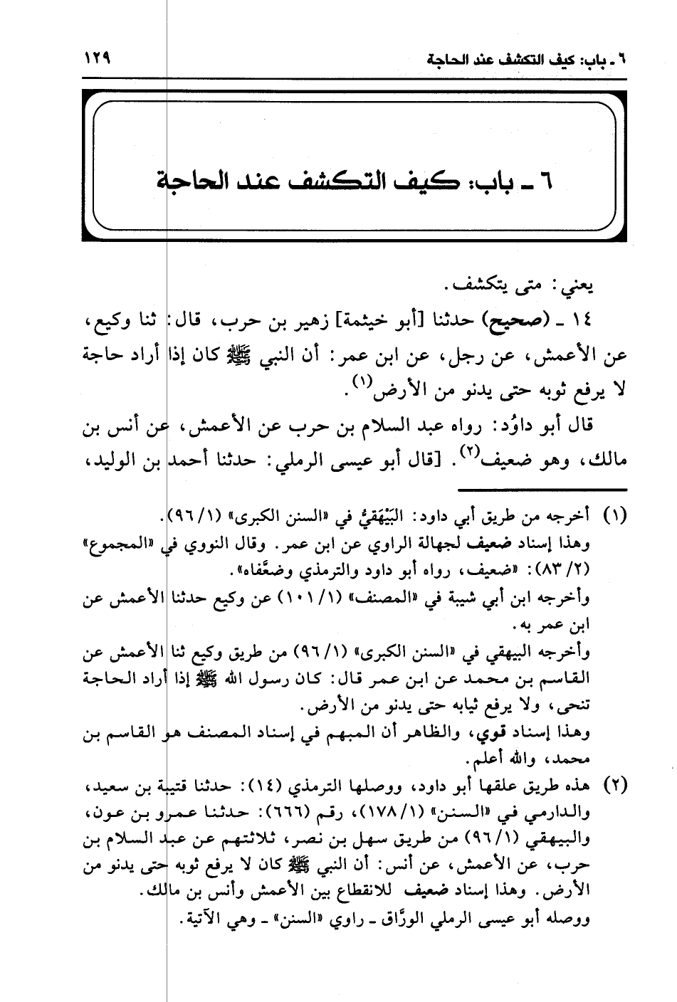 14 - (صحيح) حدثنا [أبو خيثمة] زهير بن حرب، قال: ثنا وكيع، عن الأعمش، عن رجل، عن ابن عمر: أن النبي - صلى الله عليه وسلم - كان إذا أراد حاجة لا يرفع ثوبه حتى يدنو من الأرض (¬1).