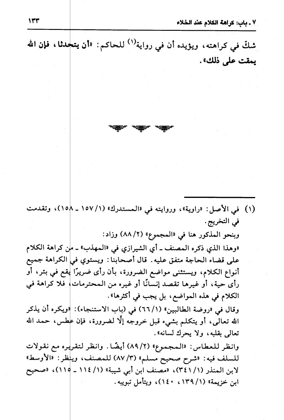 "وهذا الذي ذكره المصنف -أي الشيرازي في "المهذب"- من كراهة الكلام على قضاء الحاجة متفق عليه. قال أصحابنا: ويستوي الكراهة جميع أنواع الكلام، ويستثنى مواضع الضرورة، بأن رأى ضريرًا يقع في بئر، أو رأى حية، أو غيرها تقصد إنسانًا أو غيره من المحترمات فلا كراهة في الكلام في هذه المواضع، بل يجب في أكثرها".