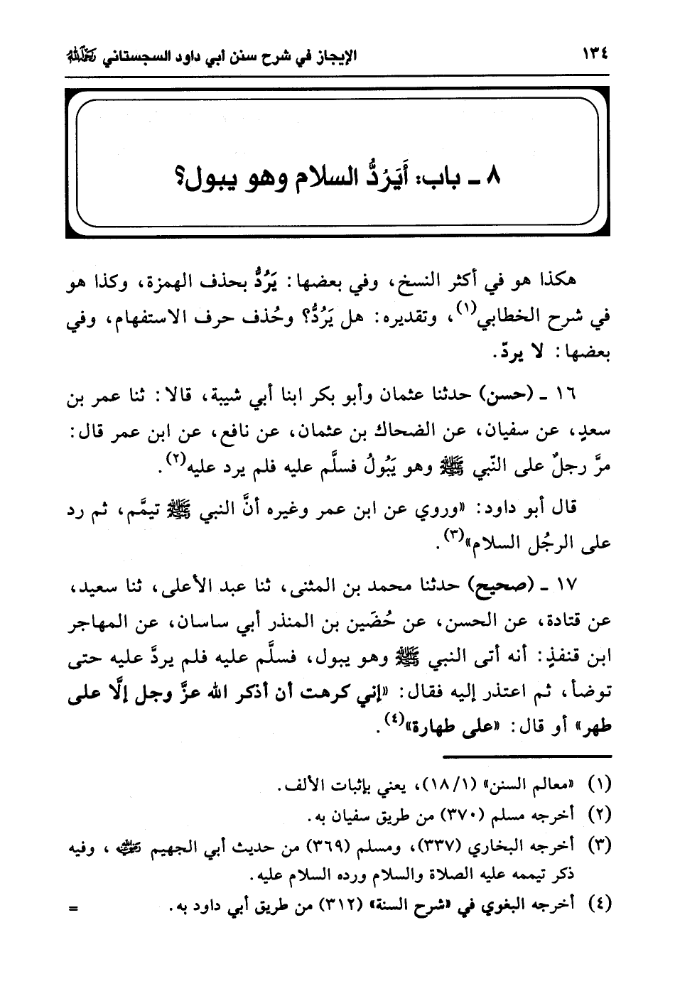 16 - (حسن) حدثنا عثمان وأبو بكر ابنا أبي شيبة، قالا: ثنا عمر بن سعدٍ، عن سفيان، عن الضحاك بن عثمان، عن نافع، عن ابن عمر قال: مرَّ رجلٌ على النّبي - صلى الله عليه وسلم - وهو يَبُولُ فسلَّم عليه فلم يرد عليه (¬2).