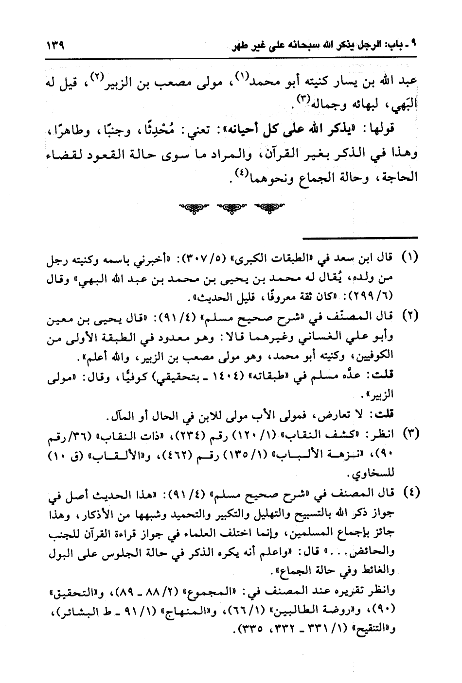 (¬4) قال المصنف في "شرح صحيح مسلم" (4/ 91): "هذا الحديث أصل في جواز ذكر الله بالتسبيح والتهليل والتكبير والتحميد وشبهها من الأذكار، وهذا جائز بإجماع المسلمين، وإنما اختلف العلماء في جواز قراءة القرآن للجنب والحائض ... " قال: "واعلم أنه يكره الذكر في حالة الجلوس على البول والغائط وفي حالة الجماع".