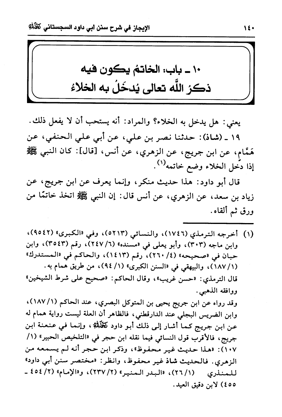 19 - (شاذ): حدثنا نصر بن علي، عن أبي علي الحنفي، عن هَمَّامٍ، عن ابن جريج، عن الزهري، عن أنس، [قال]: كان النبي - صلى الله عليه وسلم - إذا دخل الخلاء وضع خاتمه (¬1).