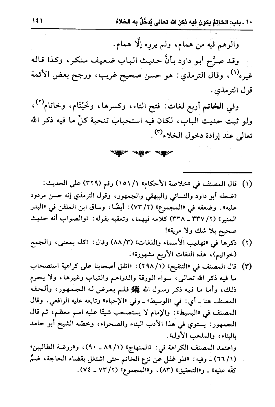 واعتمد المصنف الكراهة في: "المنهاج" (1/ 89 - 90)، و"روضة الطالبين" (1/ 66) -وفيه: "فلو غفل عن نزع الخاتم حتى اشتغل بقضاء الحاجة، ضم كفّه عليه"- و "التحقيق" (83)، و"المجموع" (2/ 73 - 74).