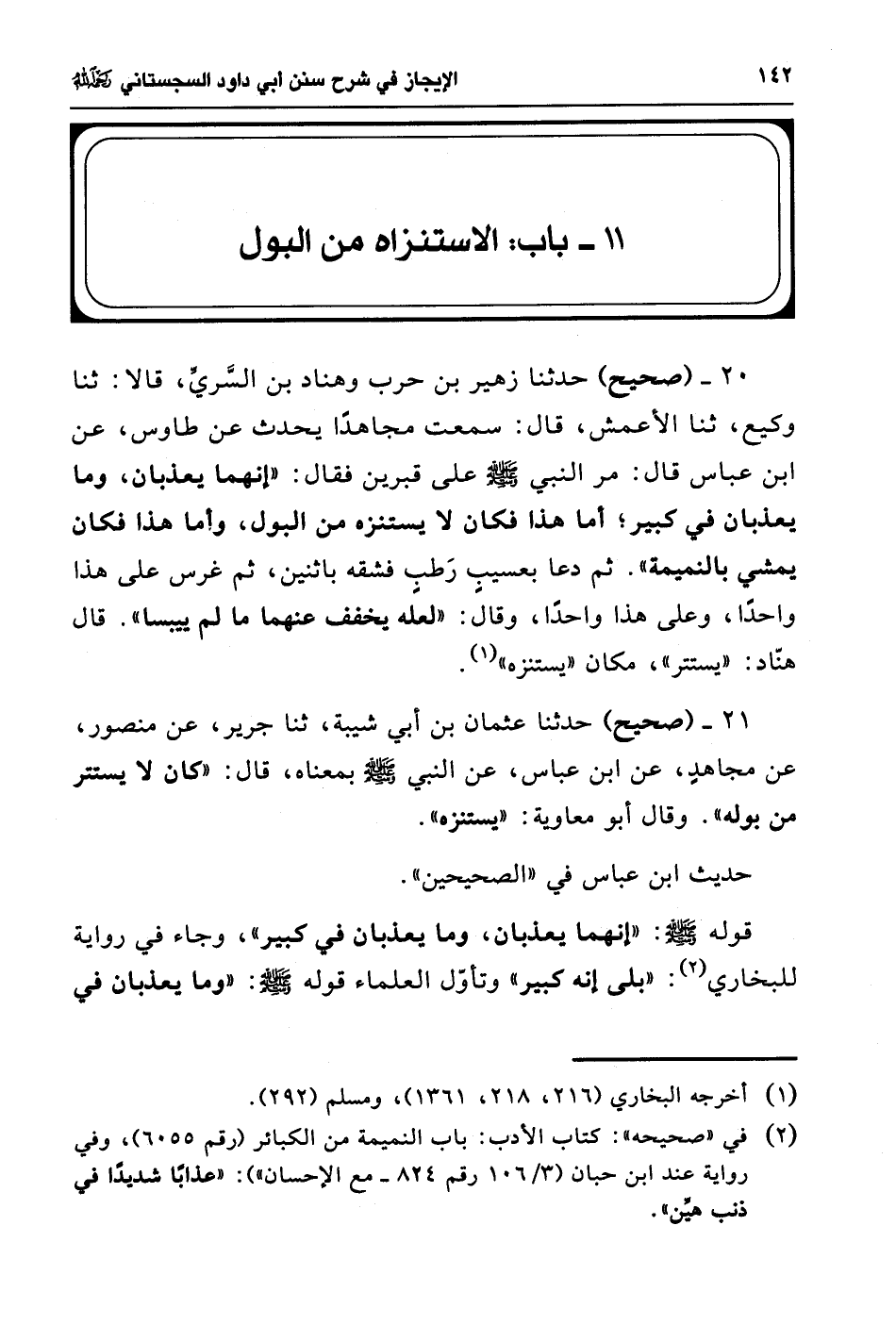 20 - (صحيح) حدثنا زهير بن حرب وهناد بن السَّريِّ، قالا: ثنا وكيع، ثنا الأعمش، قال: سمعت مجاهدًا يحدث عن طاوس، عن ابن عباس قال: مر النبي - صلى الله عليه وسلم - على قبرين فقال: " إنهما يعذبان، وما يعذبان في كبير؛ أما هذا فكان لا يستنزه من البول، وأما هذا فكان يمشي بالنميمة". ثم دعا بعسيبٍ رَطبٍ فشقه باثنين، ثم غرس على هذا واحدًا، وعلى هذا واحدًا، وقال: "لعله يخفف عنهما ما لم ييبسا". قال هنّاد: "يستتر"، مكان "يستنزه" (¬1).