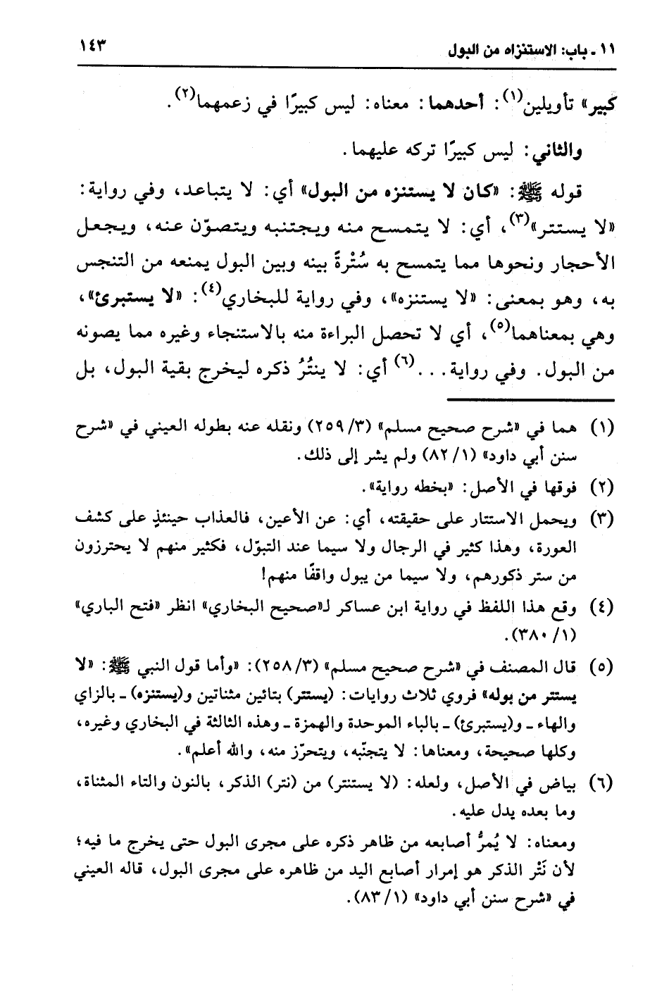 (¬5) قال المصنف في "شرح صحيح مسلم" (3/ 258): "وأما قول النبي - صلى الله عليه وسلم -: "لا يستتر من بوله" فروي ثلاث روايات: (يستتر) بتائين مثناتين و (يستنزه) -بالزاي والهاء- و (يستبريء) -بالباء الموحدة والهمزة- وهذه الثالثة في البخاري وغيره، وكلها صحيحة، ومعناها: لا يتجنّبه، ويتحرّز منه، والله أعلم".