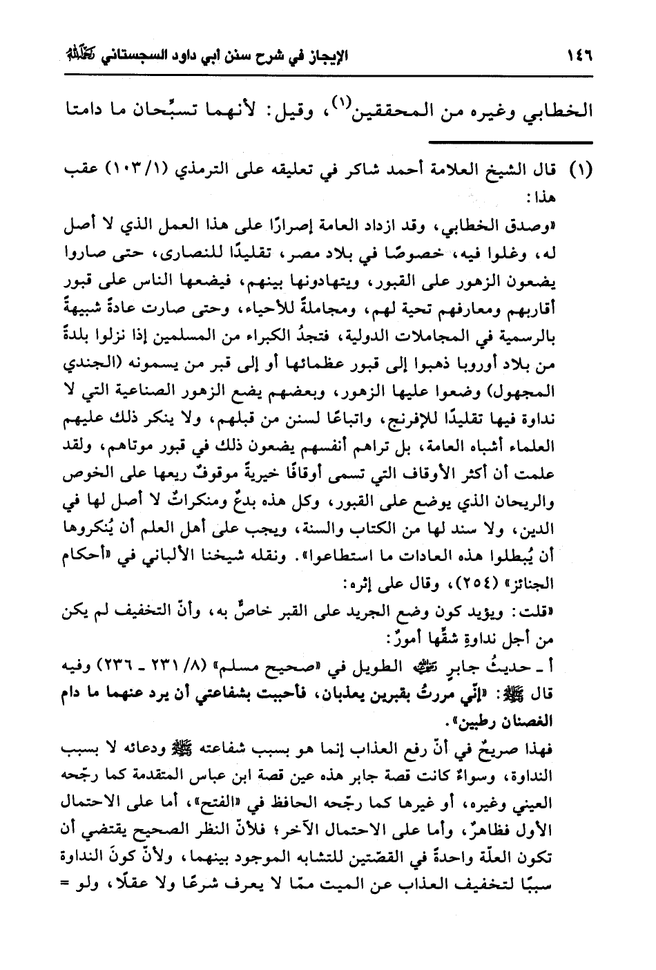 فهنا صريحٌ في أن رفع العذاب إنما هو بسبب شفاعته - صلى الله عليه وسلم - ودعائه لا بسبب النداوة، وسواءٌ كانت قصة جابر هذه عين قصة ابن عباس المتقدمة كما رجّحه العيني وغيره، أو غيرها كما رجّحه الحافظ في "الفتح"، أما على الاحتمال الأول فظاهرٌ، وأما على الاحتمال الآخر؛ فلأنّ النظر الصحيح يقتضي أن تكون العلّة واحدةً في القصّتين للتشابه الموجود بينهما، ولأنّ كونَ النداوة سببًا لتخفيف العذاب عن الميت مما لا يعرف شرعًا ولا عقلاً، ولو =